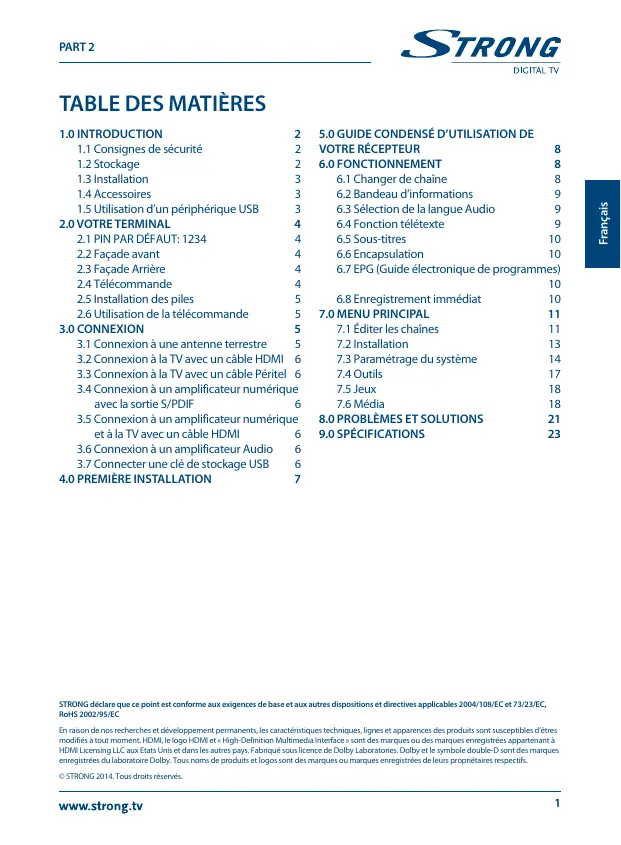 STRONG déclare que ce point est conforme aux exigences de base et aux autres dispositions et directives applicables 2004/108/EC et 73/23/EC, RoHS 2002/95/EC En raison de nos recherches et développement permanents, les caractéristiques techniques, lignes et apparences des produits sont susceptibles d’êtres modifiés à tout moment. HDMI, le logo HDMI et « High-Definition Multimedia Interface » sont des marques ou des marques enregistrées appartenant à HDMI Licensing LLC aux Etats Unis et dans les autres pays. Fabriqué sous licence de Dolby Laboratories. Dolby et le symbole double-D sont des marques enregistrées du laboratoire Dolby. Tous noms de produits et logos sont des marques ou marques enregistrées de leurs propriétaires respectifs. © STRONG 2014. Tous droits réservés.