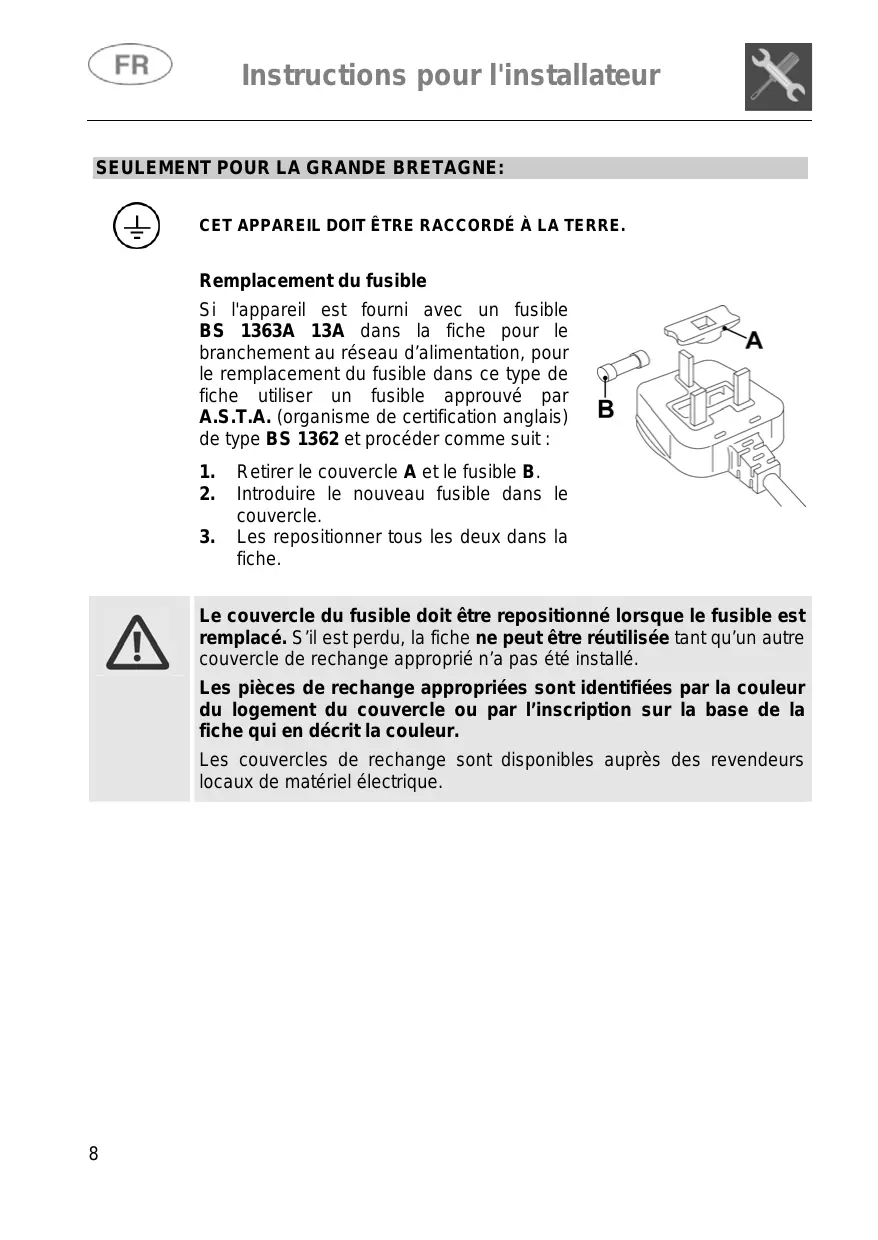 Instructions pour l'installateur SEULEMENT POUR LA GRANDE BRETAGNE: CET APPAREIL DOIT ÊTRE RACCORDÉ À LA TERRE. Remplacement du fusible Si l'appareil est fourni avec un fusible BS 1363A 13A dans la fiche pour le branchement au réseau d’alimentation, pour le remplacement du fusible dans ce type de fiche utiliser un fusible approuvé par A.S.T.A. (organisme de certification anglais) de type BS 1362 et procéder comme suit :