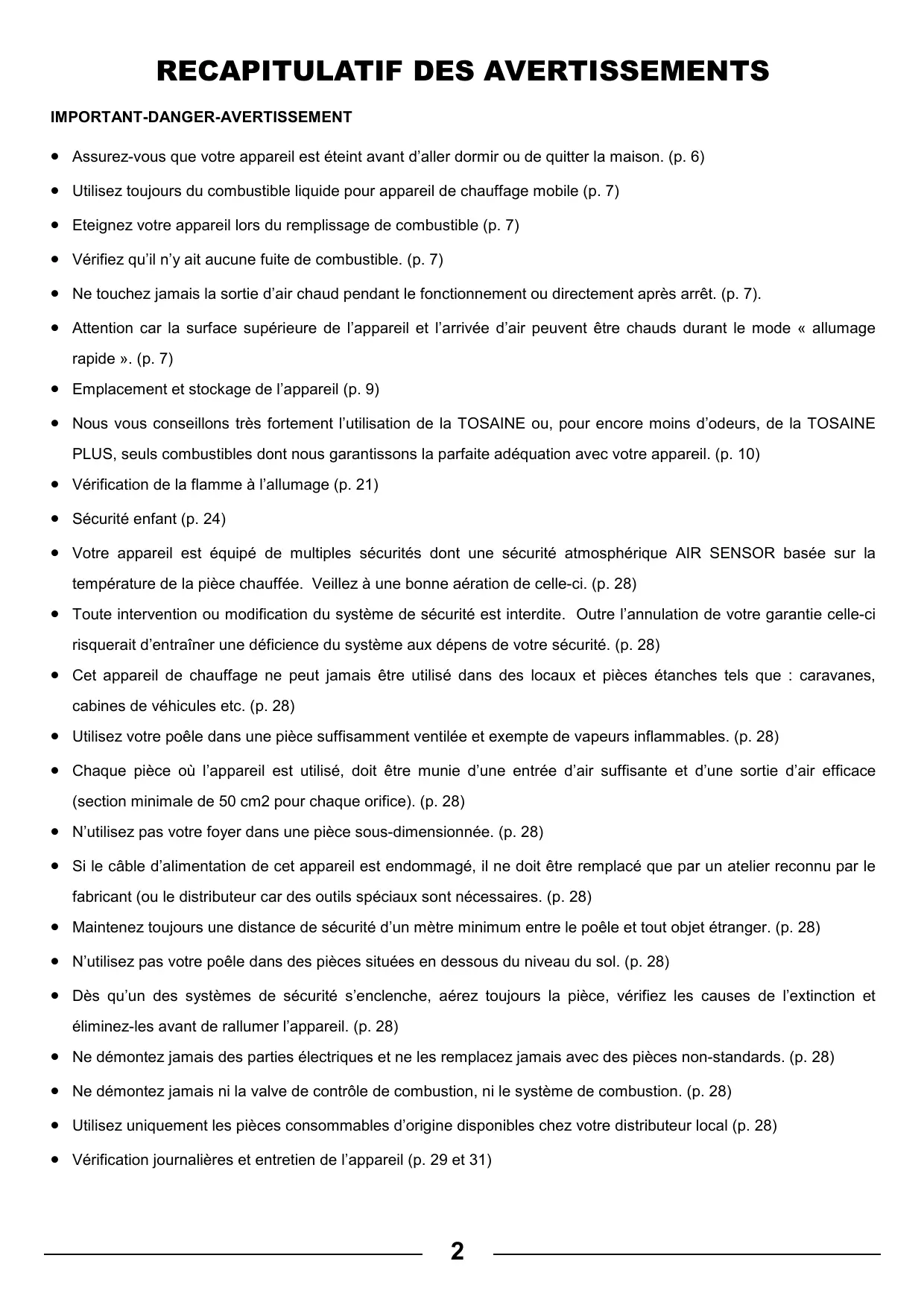 QUELQUES AVERTISSEMENTS AIR-SENSOR (breveté) Cet appareil de chauffage a été conçu avec un dispositif de sécurité air-sensor. Des conditions anormales d’emploi de votre appareil (mauvaise ventilation, emploi dans pièce trop petite, emploi derrière une fenêtre ensoleillée, dans un renfoncement, trop près d’un mur ou d’un meuble) causent l’extinction automatique de celui-ci. IMPORTANT Toute intervention ou modification du système de sécurité est interdite. Outre l’annulation de votre garantie celle-ci risquerait d’entraîner une déficience du système aux dépens de votre sécurité.