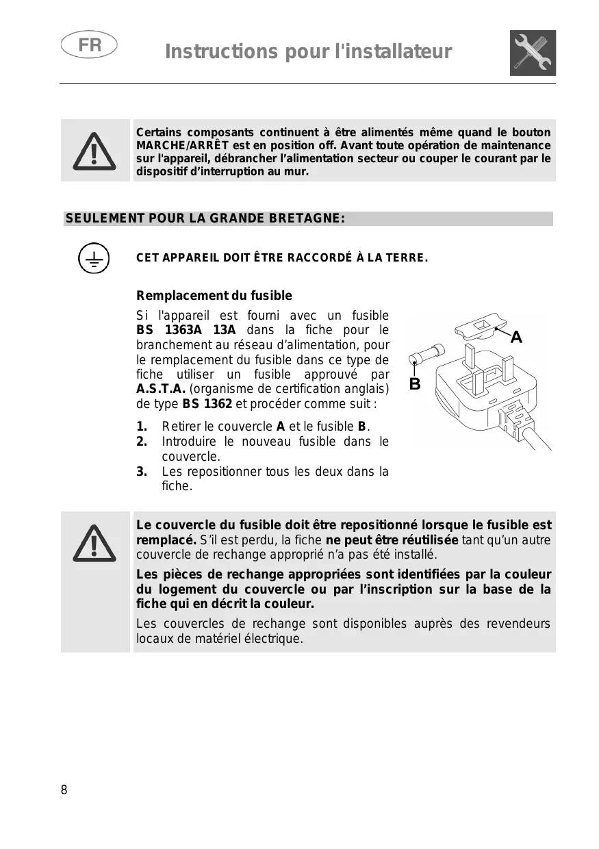 CET APPAREIL DOIT ÊTRE RACCORDÉ À LA TERRE. Remplacement du fusible Si l'appareil est fourni avec un fusible BS 1363A 13A dans la fiche pour le branchement au réseau d'alimentation, pour le remplacement du fusible dans ce type de fiche utiliser un fusible approuvé par A.S.T.A. (organisme de certification anglais) de type BS 1362 et procéder comme suit: