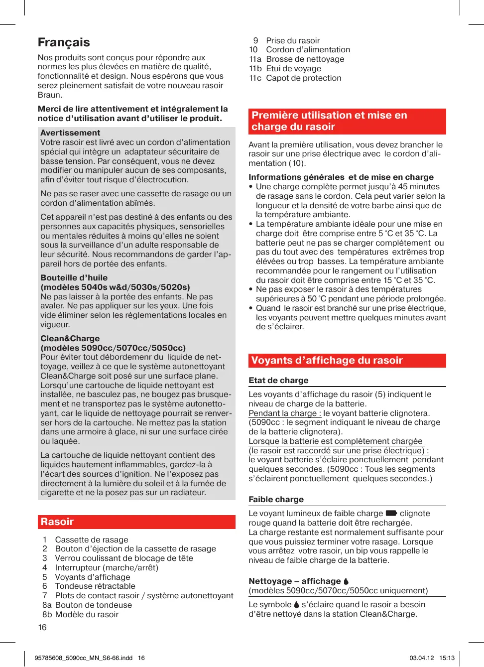 Français Nos produits sont conçus pour répondre aux normes les plus élevées en matière de qualité, fonctionnalité et design. Nous espérons que vous serez pleinement satisfait de votre nouveau rasoir Braun. Merci de lire attentivement et intégralement la notice d’utilisation avant d’utiliser le produit. Avertissement Votre rasoir est livré avec un cordon d’alimentation spécial qui intègre un adaptateur sécuritaire de basse tension. Par conséquent, vous ne devez modifier ou manipuler aucun de ses composants, afin d’éviter tout risque d’électrocution. Ne pas se raser avec une cassette de rasage ou un cordon d’alimentation abîmés. Cet appareil n’est pas destiné à des enfants ou des personnes aux capacités physiques, sensorielles ou mentales réduites à moins qu’elles ne soient sous la surveillance d’un adulte responsable de leur sécurité. Nous recommandons de garder l’appareil hors de portée des enfants. Bouteille d’huile (modèles 5040s w&d/5030s/5020s) Ne pas laisser à la portée des enfants. Ne pas avaler. Ne pas appliquer sur les yeux. Une fois vide éliminer selon les réglementations locales en vigueur. Clean&Charge (modèles 5090cc/5070cc/5050cc) Pour éviter tout débordemenr du liquide de nettoyage, veillez à ce que le système autonettoyant Clean&Charge soit posé sur une surface plane. Lorsqu’une cartouche de liquide nettoyant est installée, ne basculez pas, ne bougez pas brusquement et ne transportez pas le système autonettoyant, car le liquide de nettoyage pourrait se renverser hors de la cartouche. Ne mettez pas la station dans une armoire à glace, ni sur une surface cirée ou laquée. La cartouche de liquide nettoyant contient des liquides hautement inflammables, gardez-la à l’écart des sources d’ignition. Ne l’exposez pas directement à la lumière du soleil et à la fumée de cigarette et ne la posez pas sur un radiateur. Rasoir