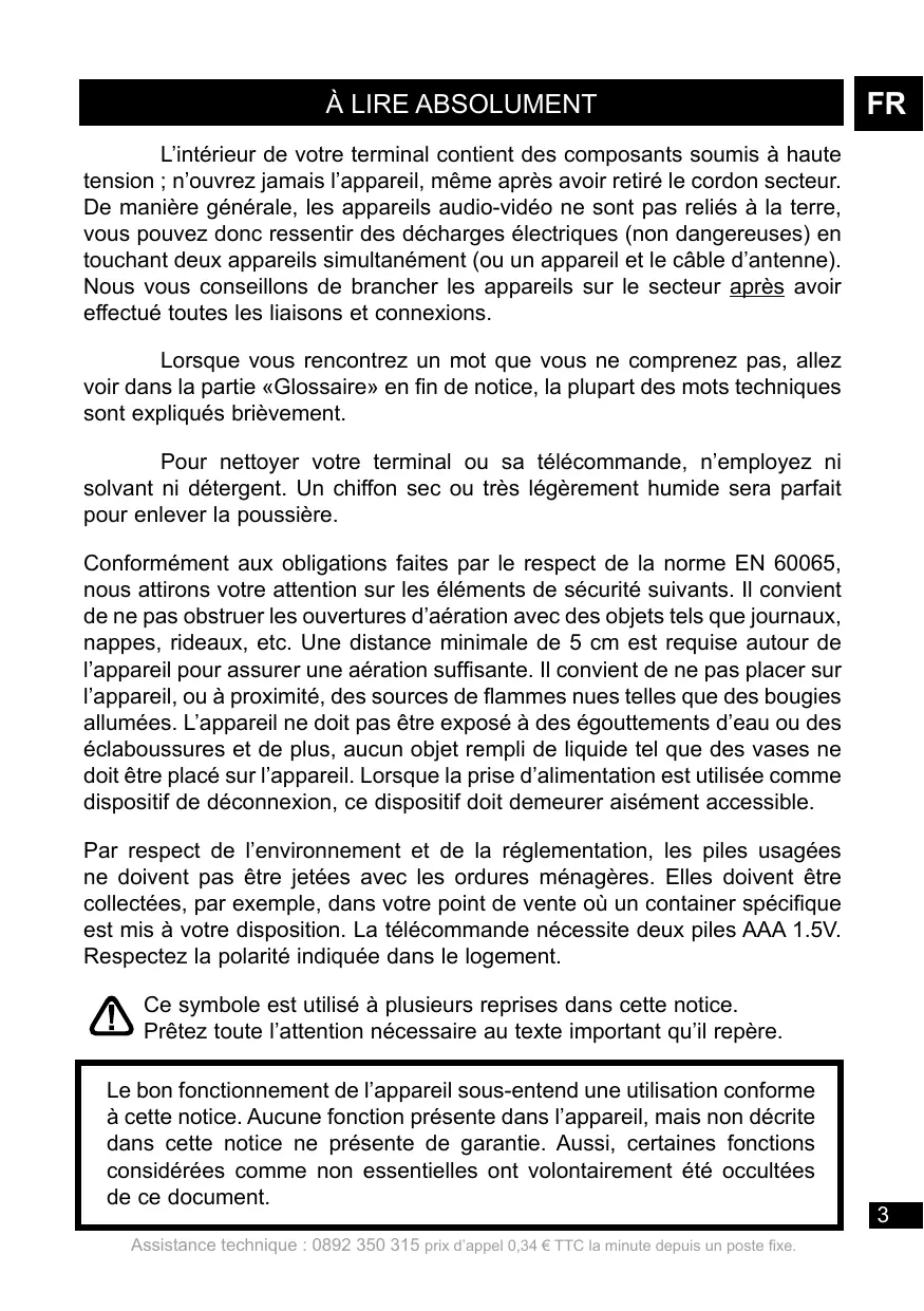 L’intérieur de votre terminal contient des composants soumis à haute tension ; n’ouvrez jamais l’appareil, même après avoir retiré le cordon secteur. De manière générale, les appareils audio-vidéo ne sont pas reliés à la terre, vous pouvez donc ressentir des décharges électriques (non dangereuses) en touchant deux appareils simultanément (ou un appareil et le câble d’antenne). Nous vous conseillons de brancher les appareils sur le secteur après avoir effectué toutes les liaisons et connexions. Lorsque vous rencontrez un mot que vous ne comprenez pas, allez voir dans la partie «Glossaire» en fin de notice, la plupart des mots techniques sont expliqués brièvement. Pour nettoyer votre terminal ou sa télécommande, n’employez ni solvant ni détergent. Un chiffon sec ou très légèrement humide sera parfait pour enlever la poussière. Conformément aux obligations faites par le respect de la norme EN 60065, nous attirons votre attention sur les éléments de sécurité suivants. Il convient de ne pas obstruer les ouvertures d’aération avec des objets tels que journaux, nappes, rideaux, etc. Une distance minimale de 5 cm est requise autour de l’appareil pour assurer une aération suffisante. Il convient de ne pas placer sur l’appareil, ou à proximité, des sources de flammes nues telles que des bougies allumées. L’appareil ne doit pas être exposé à des égouttements d’eau ou des éclaboussures et de plus, aucun objet rempli de liquide tel que des vases ne doit être placé sur l’appareil. Lorsque la prise d’alimentation est utilisée comme dispositif de déconnexion, ce dispositif doit demeurer aisément accessible. Par respect de l’environnement et de la réglementation, les piles usagées ne doivent pas être jetées avec les ordures ménagères. Elles doivent être collectées, par exemple, dans votre point de vente où un container spécifique est mis à votre disposition. La télécommande nécessite deux piles AAA 1.5V. Respectez la polarité indiquée dans le logement. Ce symbole est utilisé à plusieurs reprises dans cette notice. Prêtez toute l’attention nécessaire au texte important qu’il repère. Le bon fonctionnement de l’appareil sous-entend une utilisation conforme à cette notice. Aucune fonction présente dans l’appareil, mais non décrite dans cette notice ne présente de garantie. Aussi, certaines fonctions considérées comme non essentielles ont volontairement été occultées de ce document. Assistance technique : 0892 350 315 prix d’appel 0,34 € TTC la minute depuis un poste fixe.