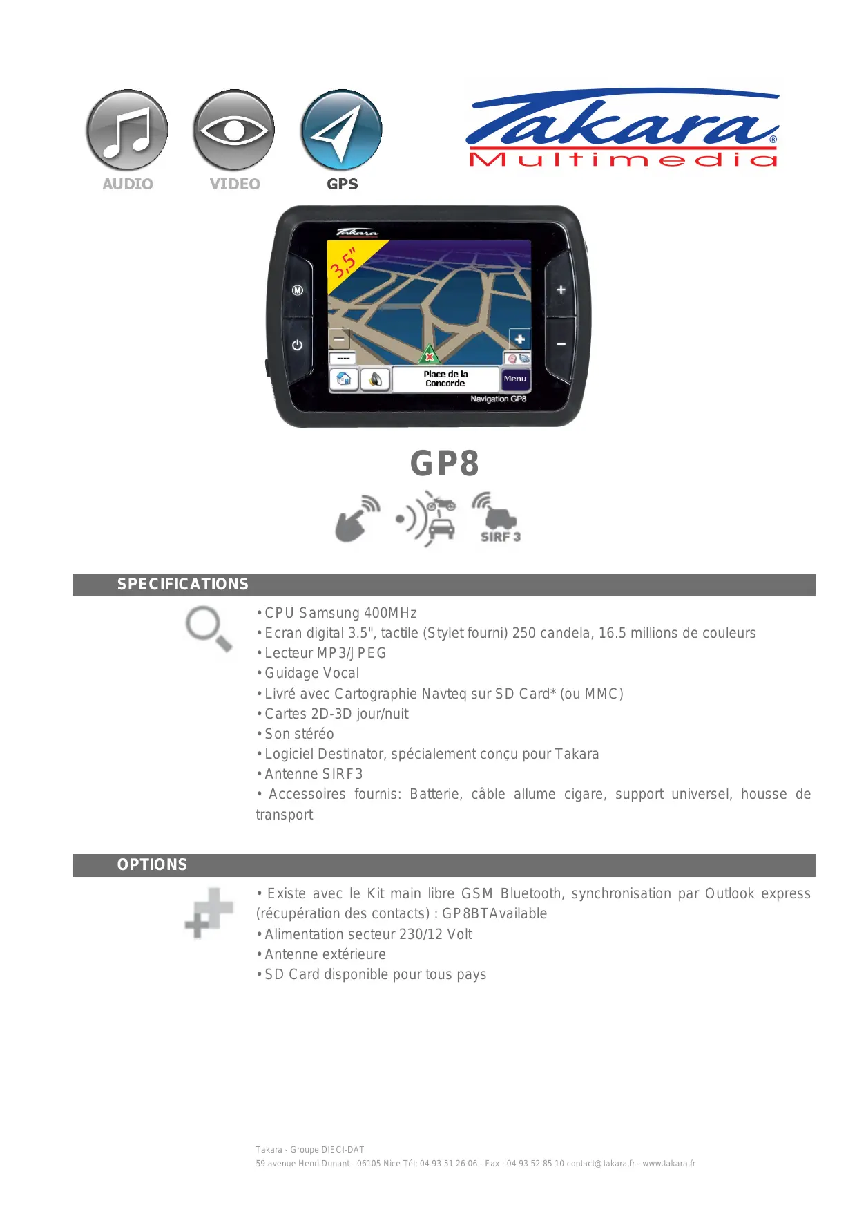 GP8 » ve 4 - CS 6 #8 À, SPECIFICATIONS O + CPU Samsung 400MHz Ecran digital 3.5", tactile (Stylet fourni) 250 candela, 16.5 millions de couleurs «Lecteur MP3/JPEG + Guidage Vocal «Livré avec Cartographie Navteq sur SD Card* (ou MMC) + Cartes 2D-3D jour/nuit + Son stéréo - Logiciel Destinator, spécialement conçu pour Takara Antenne SIRF3 - Accessoires fournis: Batterie, câble allume cigare, support universel, housse de transport OPTIONS + Existe avec le Kit main libre GSM Bluetooth, synchronisation par Outlook express + (récupération des contacts) : GP 8BTAvailable + Alimentation secteur 230/12 Volt + Antenne extérieure + SD Card disponible pour tous pays