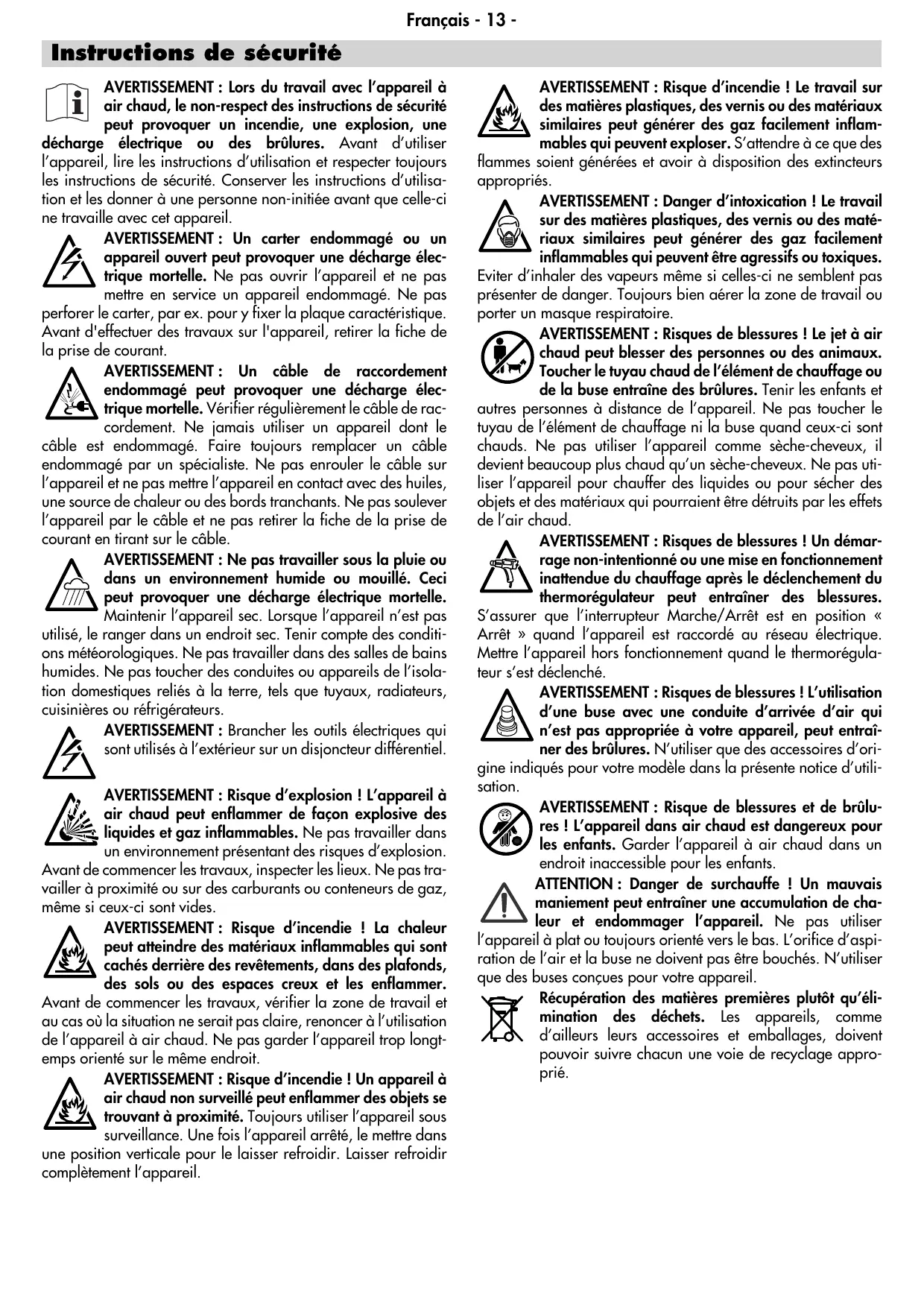 AVERTISSEMENT : Danger d’intoxication ! Le travail sur des matières plastiques, des vernis ou des matériaux similaires peut générer des gaz facilement inflammables qui peuvent être agressifs ou toxiques. Eviter d’inhaler des vapeurs même si celles-ci ne semblent pas présenter de danger. Toujours bien aérer la zone de travail ou porter un masque respiratoire. AVERTISSEMENT : Risques de blessures ! Le jet à air chaud peut blesser des personnes ou des animaux. Toucher le tuyau chaud de l’élément de chauffage ou de la buse entraîne des brûlures. Tenir les enfants et autres personnes à distance de l’appareil. Ne pas toucher le tuyau de l’élément de chauffage ni la buse quand ceux-ci sont chauds. Ne pas utiliser l’appareil comme sèche-cheveux, il devient beaucoup plus chaud qu’un sèche-cheveux. Ne pas utiliser l’appareil pour chauffer des liquides ou pour sécher des objets et des matériaux qui pourraient être détruits par les effets de l’air chaud. AVERTISSEMENT : Risques de blessures ! Un démarrage non-intentionné ou une mise en fonctionnement inattendue du chauffage après le déclenchement du thermorégulateur peut entraîner des blessures. S’assurer que l’interrupteur Marche/Arrêt est en position « Arrêt » quand l’appareil est raccordé au réseau électrique. Mettre l’appareil hors fonctionnement quand le thermorégulateur s’est déclenché. AVERTISSEMENT : Risques de blessures ! L’utilisation d’une buse avec une conduite d’arrivée d’air qui n’est pas appropriée à votre appareil, peut entraîner des brûlures. N’utiliser que des accessoires d’origine indiqués pour votre modèle dans la présente notice d’utilisation. AVERTISSEMENT : Risque de blessures et de brûlures ! L’appareil dans air chaud est dangereux pour les enfants. Garder l’appareil à air chaud dans un endroit inaccessible pour les enfants. ATTENTION : Danger de surchauffe ! Un mauvais maniement peut entraîner une accumulation de chaleur et endommager l’appareil. Ne pas utiliser l’appareil à plat ou toujours orienté vers le bas. L’orifice d’aspiration de l’air et la buse ne doivent pas être bouchés. N’utiliser que des buses conçues pour votre appareil. Récupération des matières premières plutôt qu’élimination des déchets. Les appareils, comme d’ailleurs leurs accessoires et emballages, doivent pouvoir suivre chacun une voie de recyclage approprié.