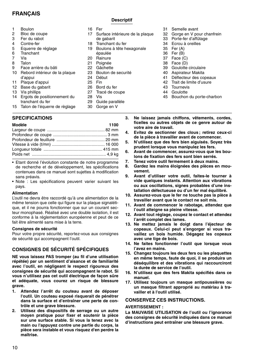 Ne laissez jamais chiffons, vêtements, cordes, ficelles ou autres objets de ce genre autour de votre aire de travail. Evitez de sectionner des clous ; retirez ceux-ci de la pièce à travailler avant de commencer. N’utilisez que des fers bien aiguisés. Soyez très prudent lorsque vous manipulez les fers. Avant de commencer, assurez-vous que les boulons de fixation des fers sont bien serrés. Tenez votre outil fermement à deux mains. Gardez les mains éloignées des pièces en mouvement. Avant d’utiliser votre outil, faites-le tourner à vide quelques instants. Attention aux vibrations ou aux oscillations, signes probables d’une installation défectueuse ou d’un fer mal équilibré. Assurez-vous que le fer ne touche pas la pièce à travailler avant que le contact ne soit mis. Avant de commencer le rabotage, attendez que l’outil atteigne sa pleine vitesse. Avant tout réglage, coupez le contact et attendez l’arrêt complet des lames. Ne mettez jamais le doigt dans l’éjecteur de copeaux. Celui-ci peut s’engorger si vous travaillez un bois humide. Dégagez les copeaux avec une tige de bois. Ne faites fonctionner l’outil que lorsque vous l’avez en mains. Changez toujours les deux fers ou les plaquettes en même temps, faute de quoi, il se produira un déséquilibre et des vibrations qui raccourciront la durée de service de l’outil. N’utilisez que des fers Makita spécifiés dans ce manuel. Utilisez toujours un masque antipoussières ou un masque filtrant approprié au matériau à travailler et à l'outil utilisé.