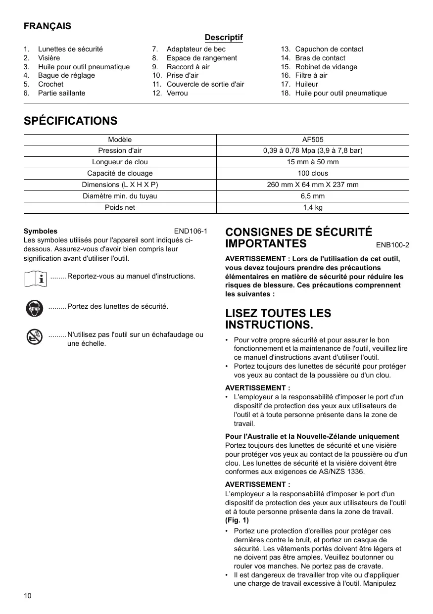 (2) Avant d'effectuer tout travail de maintenance ou de réparation sur l'outil. Fréquence de clouage (clous/min)