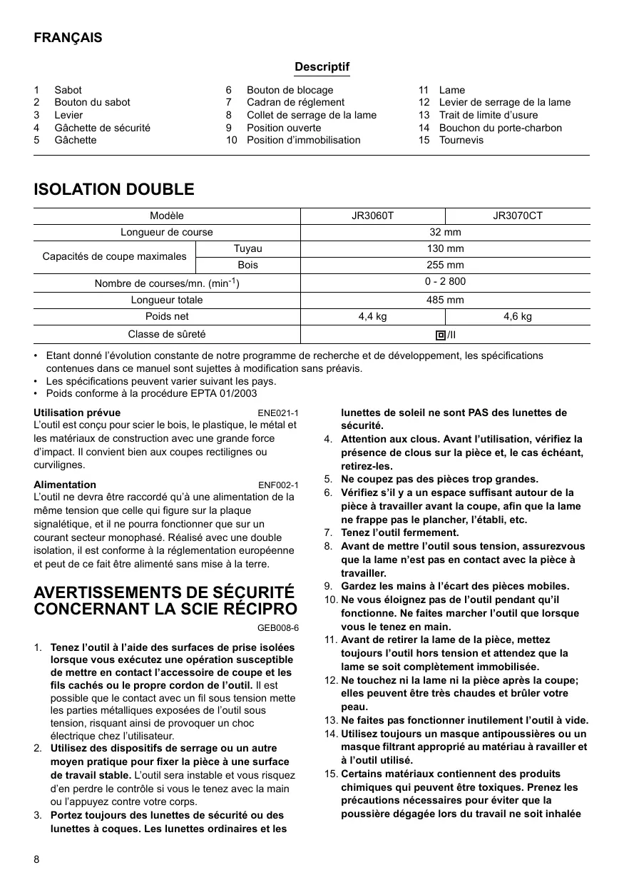 • Les spécifications peuvent varier suivant les pays. • Poids conforme à la procédure EPTA 01/2003 Utilisation prévue ENE021-1 L’outil est conçu pour scier le bois, le plastique, le métal et les matériaux de construction avec une grande force d’impact. Il convient bien aux coupes rectilignes ou curvilignes. Alimentation ENF002-1 L’outil ne devra être raccordé qu’à une alimentation de la même tension que celle qui figure sur la plaque signalétique, et il ne pourra fonctionner que sur un courant secteur monophasé. Réalisé avec une double isolation, il est conforme à la réglementation européenne et peut de ce fait être alimenté sans mise à la terre.