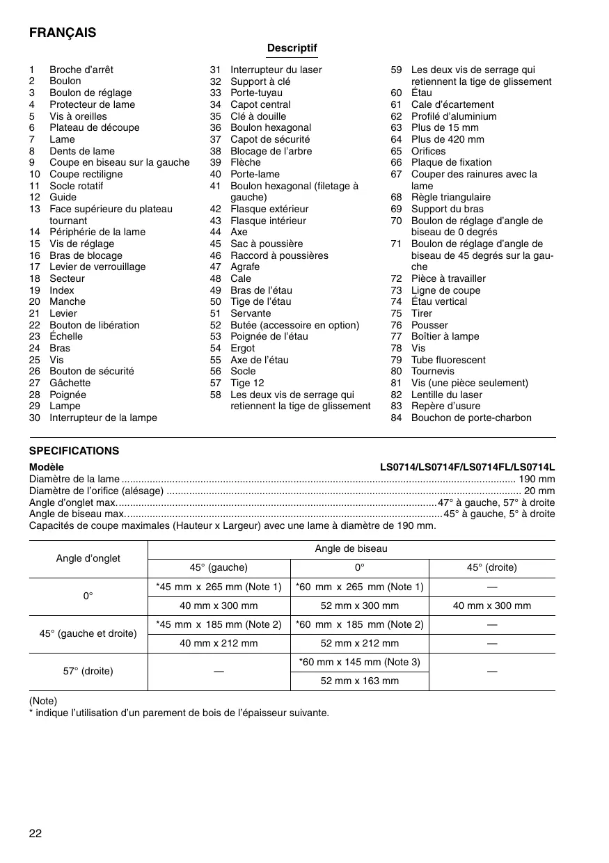 - Interrupteur du laser Support à clé Porte-tuyau Capot central Clé à douille Boulon hexagonal Capot de sécurité Blocage de l’arbre Flèche Porte-lame Boulon hexagonal (filetage à gauche) Flasque extérieur Flasque intérieur Axe Sac à poussière Raccord à poussières Agrafe Cale Bras de l’étau Tige de l’étau Servante Butée (accessoire en option) Poignée de l’étau Ergot Axe de l’étau Socle Tige 12 Les deux vis de serrage qui retiennent la tige de glissement 59 Les deux vis de serrage qui retiennent la tige de glissement 60 Étau 61 Cale d’écartement 62 Profilé d’aluminium 63 Plus de 15 mm 64 Plus de 420 mm 65 Orifices 66 Plaque de fixation 67 Couper des rainures avec la lame 68 Règle triangulaire 69 Support du bras 70 Boulon de réglage d’angle de biseau de 0 degrés 71 Boulon de réglage d’angle de biseau de 45 degrés sur la gauche 72 Pièce à travailler 73 Ligne de coupe 74 Étau vertical 75 Tirer 76 Pousser 77 Boîtier à lampe 78 Vis 79 Tube fluorescent 80 Tournevis 81 Vis (une pièce seulement) 82 Lentille du laser 83 Repère d’usure 84 Bouchon de porte-charbon SPECIFICATIONS Modèle LS0714/LS0714F/LS0714FL/LS0714L Diamètre de la lame p. 190
