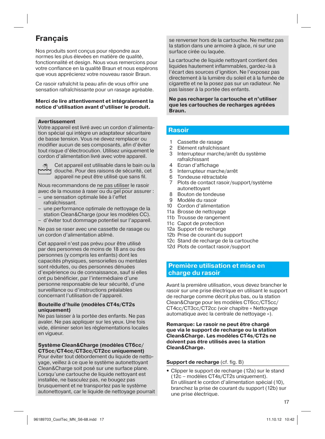 Français Nos produits sont conçus pour répondre aux normes les plus élevées en matière de qualité, fonctionnalité et design. Nous vous remercions pour votre confiance en la qualité Braun et nous espérons que vous apprécierez votre nouveau rasoir Braun. Ce rasoir rafraîchit la peau afin de vous offrir une sensation rafraîchissante pour un rasage agréable. Merci de lire attentivement et intégralement la notice d’utilisation avant d’utiliser le produit. Avertissement Votre appareil est livré avec un cordon d’alimentation spécial qui intègre un adaptateur sécuritaire de basse tension. Vous ne devez remplacer ou modifier aucun de ses composants, afin d’éviter tout risque d’électrocution. Utilisez uniquement le cordon d’alimentation livré avec votre appareil. Cet appareil est utilisable dans le bain ou la douche. Pour des raisons de sécurité, cet appareil ne peut être utilisé que sans fil. Nous recommandons de ne pas utiliser le rasoir avec de la mousse à raser ou du gel pour assurer : – une sensation optimale liée à l’effet rafraîchissant. – une performance optimale de nettoyage de la station Clean&Charge (pour les modèles CC). – d’éviter tout dommage potentiel sur l’appareil. Ne pas se raser avec une cassette de rasage ou un cordon d’alimentation abîmé. Cet appareil n’est pas prévu pour être utilisé par des personnes de moins de 18 ans ou des personnes (y compris les enfants) dont les capacités physiques, sensorielles ou mentales sont réduites, ou des personnes dénuées d’expérience ou de connaissance, sauf si elles ont pu bénéficier, par l’intermédiaire d’une personne responsable de leur sécurité, d’une surveillance ou d’instructions préalables concernant l’utilisation de l’appareil. Bouteille d’huile (modèles CT4s/CT2s uniquement) Ne pas laisser à la portée des enfants. Ne pas avaler. Ne pas appliquer sur les yeux. Une fois vide, éliminer selon les réglementations locales en vigueur. Système Clean&Charge (modèles CT6cc/ CT5cc/CT4cc/CT3cc/CT2cc uniquement) Pour éviter tout débordement du liquide de nettoyage, veillez à ce que le système autonettoyant Clean&Charge soit posé sur une surface plane. Lorsqu’une cartouche de liquide nettoyant est installée, ne basculez pas, ne bougez pas brusquement et ne transportez pas le système autonettoyant, car le liquide de nettoyage pourrait se renverser hors de la cartouche. Ne mettez pas la station dans une armoire à glace, ni sur une surface cirée ou laquée. La cartouche de liquide nettoyant contient des liquides hautement inflammables, gardez-la à l’écart des sources d’ignition. Ne l’exposez pas directement à la lumière du soleil et à la fumée de cigarette et ne la posez pas sur un radiateur. Ne pas laisser à la portée des enfants. Ne pas recharger la cartouche et n’utiliser que les cartouches de recharges agréées Braun. Rasoir 1 Cassette de rasage 2 Elément rafraîchissant 3 Interrupteur marche/arrêt du système rafraîchissant 4 Ecran d’affichage 5 Interrupteur marche/arrêt 6 Tondeuse rétractable 7 Plots de contact rasoir/support/système autonettoyant 8 Bouton de tondeuse 9 Modèle du rasoir 10 Cordon d’alimentation 11a Brosse de nettoyage 11b Trousse de rangement 11c Capot de protection 12a Support de recharge 12b Prise de courant du support 12c Stand de recharge de la cartouche 12d Plots de contact rasoir/support Première utilisation et mise en charge du rasoir Avant la première utilisation, vous devez brancher le rasoir sur une prise électrique en utilisant le support de recharge comme décrit plus bas, ou la station Clean&Charge pour les modèles CT6cc/CT5cc/ CT4cc/CT3cc/CT2cc (voir chapitre « Nettoyage automatique avec la centrale de nettoyage »). Remarque: Le rasoir ne peut être chargé que via le support de recharge ou la station Clean&Charge. Les modèles CT4s/CT2s ne doivent pas être utilisés avec la station Clean&Charge. Support de recharge (cf. fig. B)