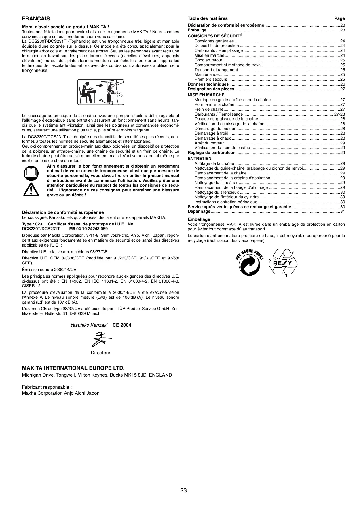 M6 04 10 24243 059 Votre tronçonneuse MAKITA est livrée dans un emballage de protection en carton pour éviter tout dommage dû au transport. fabriqués par Makita Corporation, 3-11-8, Sumiyoshi-cho, Anjo, Aichi, Japan, répondent aux exigences fondamentales en matière de sécurité et de santé des directives applicables de l'U.E. : Le carton étant une matière première de base, il est recyclable ou approprié pour le recyclage (réutilisation des vieux papiers). Toutes nos félicitations pour avoir choisi une tronçonneuse MAKITA ! Nous sommes convaincus que cet outil moderne saura vous satisfaire. La DCS230T/DCS231T (Tophandle) est une tronçonneuse très légère et maniable équipée d'une poignée sur le dessus. Ce modèle a été conçu spécialement pour la chirurgie arboricole et le traitement des arbres. Seules les personnes ayant reçu une formation en travail sur des plates-formes élevées (nacelles élévatrices, appareils élévateurs) ou sur des plates-formes montées sur échelles, ou qui ont appris les techniques de l'escalade des arbres avec des cordes sont autorisées à utiliser cette tronçonneuse. Le graissage automatique de la chaîne avec une pompe à huile à débit réglable et l'allumage électronique sans entretien assurent un fonctionnement sans heurts, tandis que le système anti-vibration, ainsi que les poignées et commandes ergonomiques, assurent une utilisation plus facile, plus sûre et moins fatigante. La DCS230T/DCS231T est équipée des dispositifs de sécurité les plus récents, conformes à toutes les normes de sécurité allemandes et internationales. Ceux-ci comprennent un protège-main aux deux poignées, un dispositif de protection de la poignée, un attrape-chaîne, une chaîne de sécurité et un frein de chaîne. Le frein de chaîne peut être activé manuellement, mais il s'active aussi de lui-même par inertie en cas de choc en retour. Afin d'assurer le bon fonctionnement et d'obtenir un rendement optimal de votre nouvelle tronçonneuse, ainsi que par mesure de sécurité personnelle, vous devez lire en entier le présent manuel d'instructions avant de commencer l'utilisation. Veuillez prêter une attention particulière au respect de toutes les consignes de sécurité ! L'ignorance de ces consignes peut entraîner une blessure grave ou un décès ! Page Directive U.E. relative aux machines 98/37/CE, Directive U.E. CEM 89/336/CEE (modifiée par 91/263/CCE, 92/31/CEE et 93/68/ CEE), RE Y Émission sonore 2000/14/CE. Les principales normes appliquées pour répondre aux exigences des directives U.E. ci-dessus ont été : EN 14982, EN ISO 11681-2, EN 61000-4-2, EN 61000-4-3, CISPR 12. La procédure d'évaluation de la conformité à 2000/14/CE a été exécutée selon l'Annexe V. Le niveau sonore mesuré (Lwa) est de 106 dB (A). Le niveau sonore garanti (Ld) est de 107 dB (A). L'examen CE de type 98/37/CE a été exécuté par : TÜV Product Service GmbH, Zertifizierstelle, Ridlerstr. 31, D-80339 Munich. Yasuhiko Kanzaki CE 2004 Directeur Carburants / Remplissage ATTENTION : Cette tronçonneuse est conçue spécialement pour le traitement des arbres et la chirurgie arboricole. Tout travail effectué avec cette tronçonneuse doit l'être exclusivement par des personnes ayant reçu une formation adéquate. Lisez la documentation, respectez les procédures et suivez les recommandations de votre association professionnelle. Autrement le risque d'accident est très élevé ! Pour scier dans les arbres, nous conseillons l'utilisation d'une plateforme élevée (nacelle élévatrice, appareil élévateur). Le travail avec la technique de descente est extrêmement dangereux et requiert une formation spéciale ! L'utilisateur doit être initié aux dispositifs de sécurité et familier avec ces derniers, ainsi qu'avec les techniques de travail et d'escalade dans les arbres ! Utilisez toujours des sangles, cordes et mousquetons adéquats pour travailler dans les arbres. Utilisez toujours des dispositifs de retenue pour vous-même et pour la tronçonneuse !