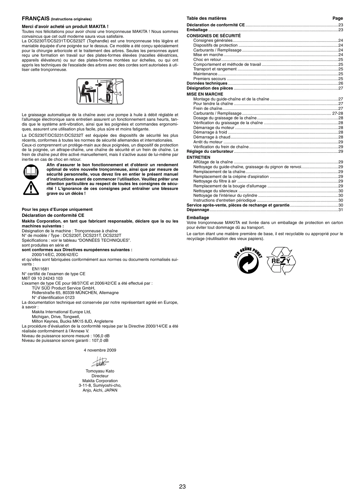 - Dépannage Toutes nos félicitations pour avoir choisi une tronçonneuse MAKITA ! Nous sommes convaincus que cet outil moderne saura vous satisfaire. La DCS230T/DCS231T/DCS232T (Tophandle) est une tronçonneuse très légère et maniable équipée d'une poignée sur le dessus. Ce modèle a été conçu spécialement pour la chirurgie arboricole et le traitement des arbres. Seules les personnes ayant reçu une formation en travail sur des plates-formes élevées (nacelles élévatrices, appareils élévateurs) ou sur des plates-formes montées sur échelles, ou qui ont appris les techniques de l'escalade des arbres avec des cordes sont autorisées à utiliser cette tronçonneuse. Le graissage automatique de la chaîne avec une pompe à huile à débit réglable et l'allumage électronique sans entretien assurent un fonctionnement sans heurts, tandis que le système anti-vibration, ainsi que les poignées et commandes ergonomiques, assurent une utilisation plus facile, plus sûre et moins fatigante. La DCS230T/DCS231/DCS232T est équipée des dispositifs de sécurité les plus récents, conformes à toutes les normes de sécurité allemandes et internationales. Ceux-ci comprennent un protège-main aux deux poignées, un dispositif de protection de la poignée, un attrape-chaîne, une chaîne de sécurité et un frein de chaîne. Le frein de chaîne peut être activé manuellement, mais il s'active aussi de lui-même par inertie en cas de choc en retour. Afin d'assurer le bon fonctionnement et d'obtenir un rendement optimal de votre nouvelle tronçonneuse, ainsi que par mesure de sécurité personnelle, vous devez lire en entier le présent manuel d'instructions avant de commencer l'utilisation. Veuillez prêter une attention particulière au respect de toutes les consignes de sécurité ! L'ignorance de ces consignes peut entraîner une blessure grave ou un décès ! Pour les pays d’Europe uniquement Déclaration de conformité CE Page Emballage Makita Corporation, en tant que fabricant responsable, déclare que la ou les machines suivantes : Désignation de la machine : Tronçonneuse à chaîne N° de modèle / Type : DCS230T, DCS231T, DCS232T Spécifications : voir le tableau “DONNÉES TECHNIQUES”. sont produites en série et sont conformes aux Directives européennes suivantes : 2000/14/EC, 2006/42/EC et qu’elles sont fabriquées conformément aux normes ou documents normalisés suivants : EN11681 N° certifié de l’examen de type CE M6T 09 10 24243 103 L’examen de type CE pour 98/37/CE et 2006/42/CE a été effectué par : TÜV SÜD Product Service GmbH, Ridlerstraße 65, 80339 MÜNCHEN, Allemagne N° d’identification 0123 La documentation technique est conservée par notre représentant agréé en Europe, à savoir : Makita International Europe Ltd, Michigan, Drive, Tongwell, Milton Keynes, Bucks MK15 8JD, Angleterre La procédure d’évaluation de la conformité requise par la Directive 2000/14/CE a été réalisée conformément à l’Annexe V. Niveau de puissance sonore mesuré : 106,0 dB Niveau de puissance sonore garanti : 107,0 dB Votre tronçonneuse MAKITA est livrée dans un emballage de protection en carton pour éviter tout dommage dû au transport. Le carton étant une matière première de base, il est recyclable ou approprié pour le recyclage (réutilisation des vieux papiers). RE Y 4 novembre 2009 Carburants / Remplissage ATTENTION : Cette tronçonneuse est conçue spécialement pour le traitement des arbres et la chirurgie arboricole. Tout travail effectué avec cette tronçonneuse doit l'être exclusivement par des personnes ayant reçu une formation adéquate. Lisez la documentation, respectez les procédures et suivez les recommandations de votre association professionnelle. Autrement le risque d'accident est très élevé ! Pour scier dans les arbres, nous conseillons l'utilisation d'une plateforme élevée (nacelle élévatrice, appareil élévateur). Le travail avec la technique de descente est extrêmement dangereux et requiert une formation spéciale ! L'utilisateur doit être initié aux dispositifs de sécurité et familier avec ces derniers, ainsi qu'avec les techniques de travail et d'escalade dans les arbres ! Utilisez toujours des sangles, cordes et mousquetons adéquats pour travailler dans les arbres. Utilisez toujours des dispositifs de retenue pour vous-même et pour la tronçonneuse ! p. 31