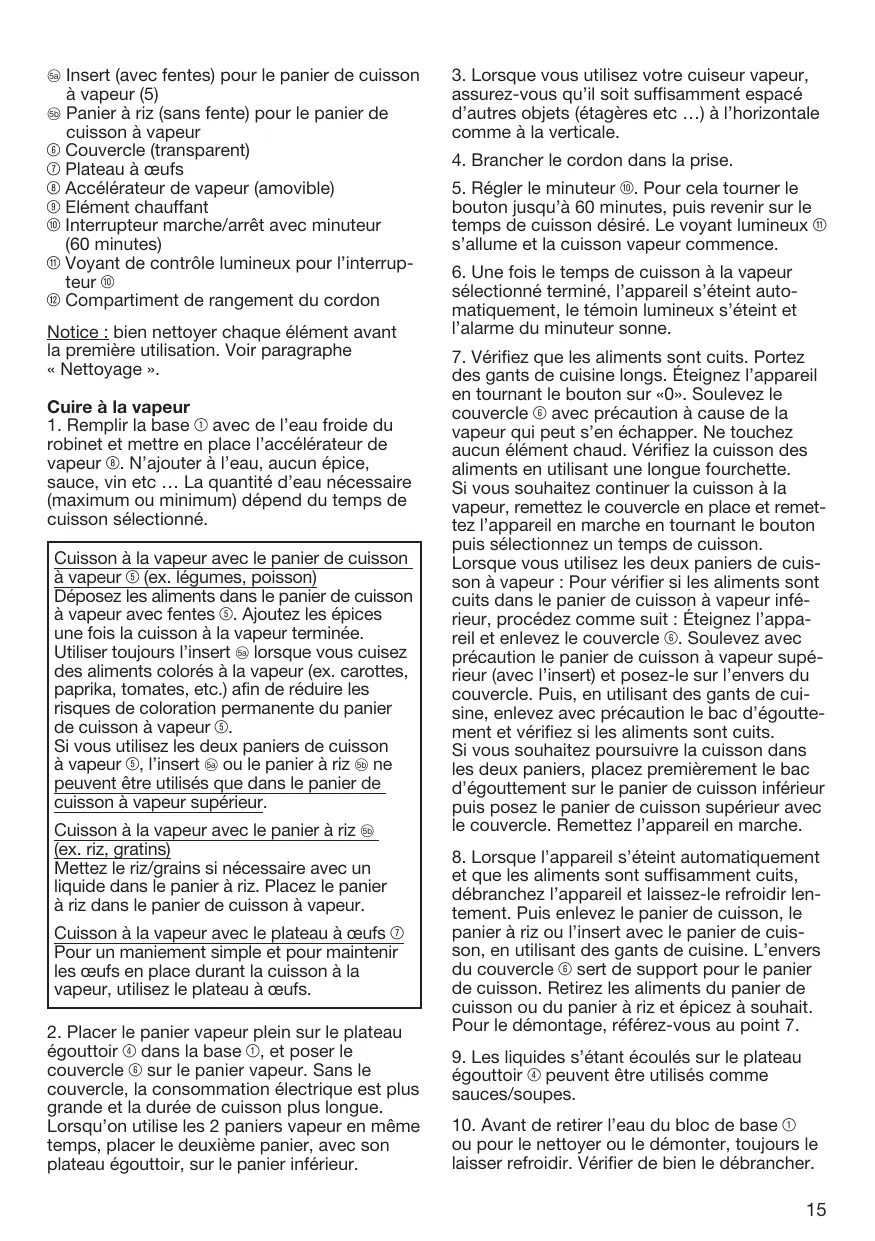 des gants de cuisine longs. Éteignez l’appareil en tournant le bouton sur «0». Soulevez le couvercle 6 avec précaution à cause de la vapeur qui peut s’en échapper. Ne touchez aucun élément chaud. Vérifiez la cuisson des aliments en utilisant une longue fourchette. Si vous souhaitez continuer la cuisson à la vapeur, remettez le couvercle en place et remettez l’appareil en marche en tournant le bouton puis sélectionnez un temps de cuisson. Lorsque vous utilisez les deux paniers de cuisson à vapeur : Pour vérifier si les aliments sont cuits dans le panier de cuisson à vapeur inférieur, procédez comme suit : Éteignez l’appareil et enlevez le couvercle 6. Soulevez avec précaution le panier de cuisson à vapeur supérieur (avec l’insert) et posez-le sur l’envers du couvercle. Puis, en utilisant des gants de cuisine, enlevez avec précaution le bac d’égouttement et vérifiez si les aliments sont cuits. Si vous souhaitez poursuivre la cuisson dans les deux paniers, placez premièrement le bac d’égouttement sur le panier de cuisson inférieur puis posez le panier de cuisson supérieur avec le couvercle. Remettez l’appareil en marche.