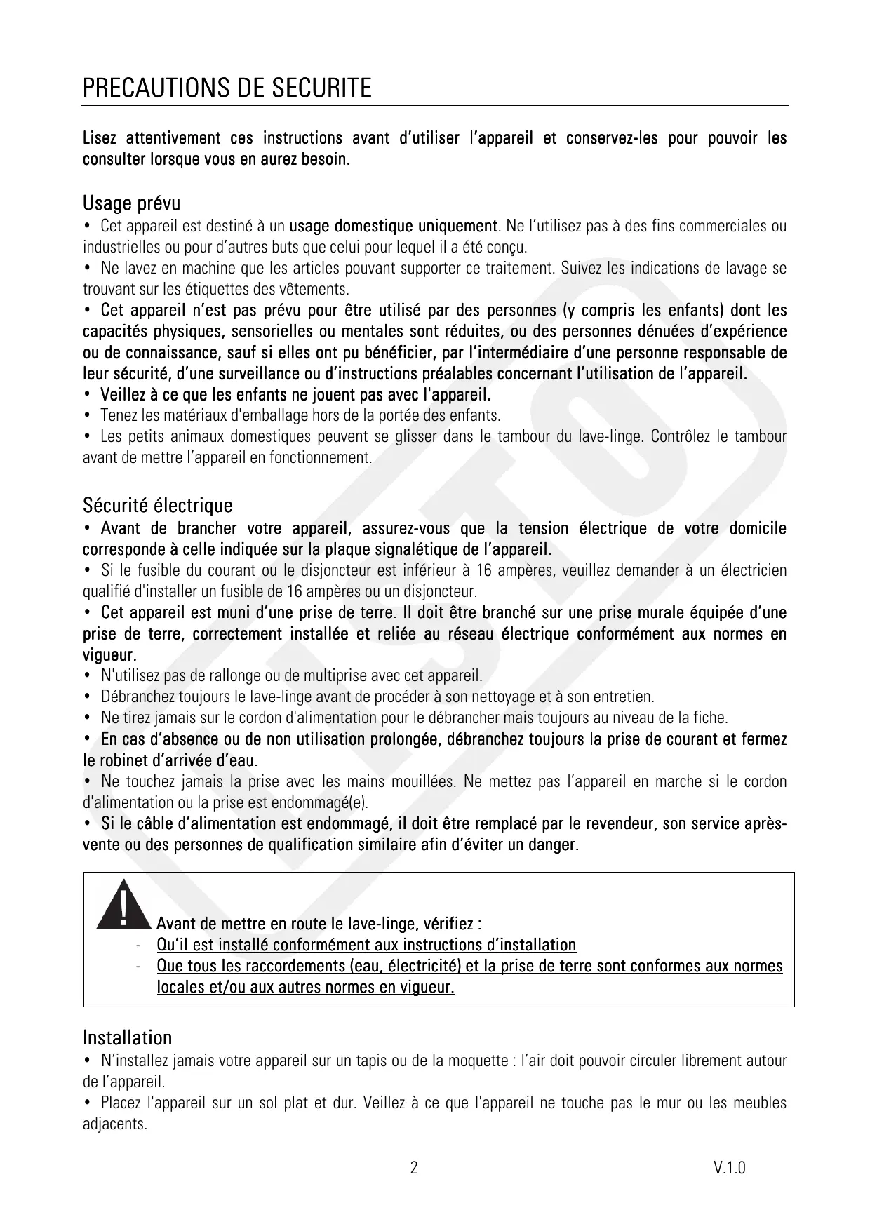 - Les petits animaux domestiques peuvent se glisser dans le tambour du lave-linge. Contrôlez le tambour avant de mettre l’appareil en fonctionnement. Sécurité électrique