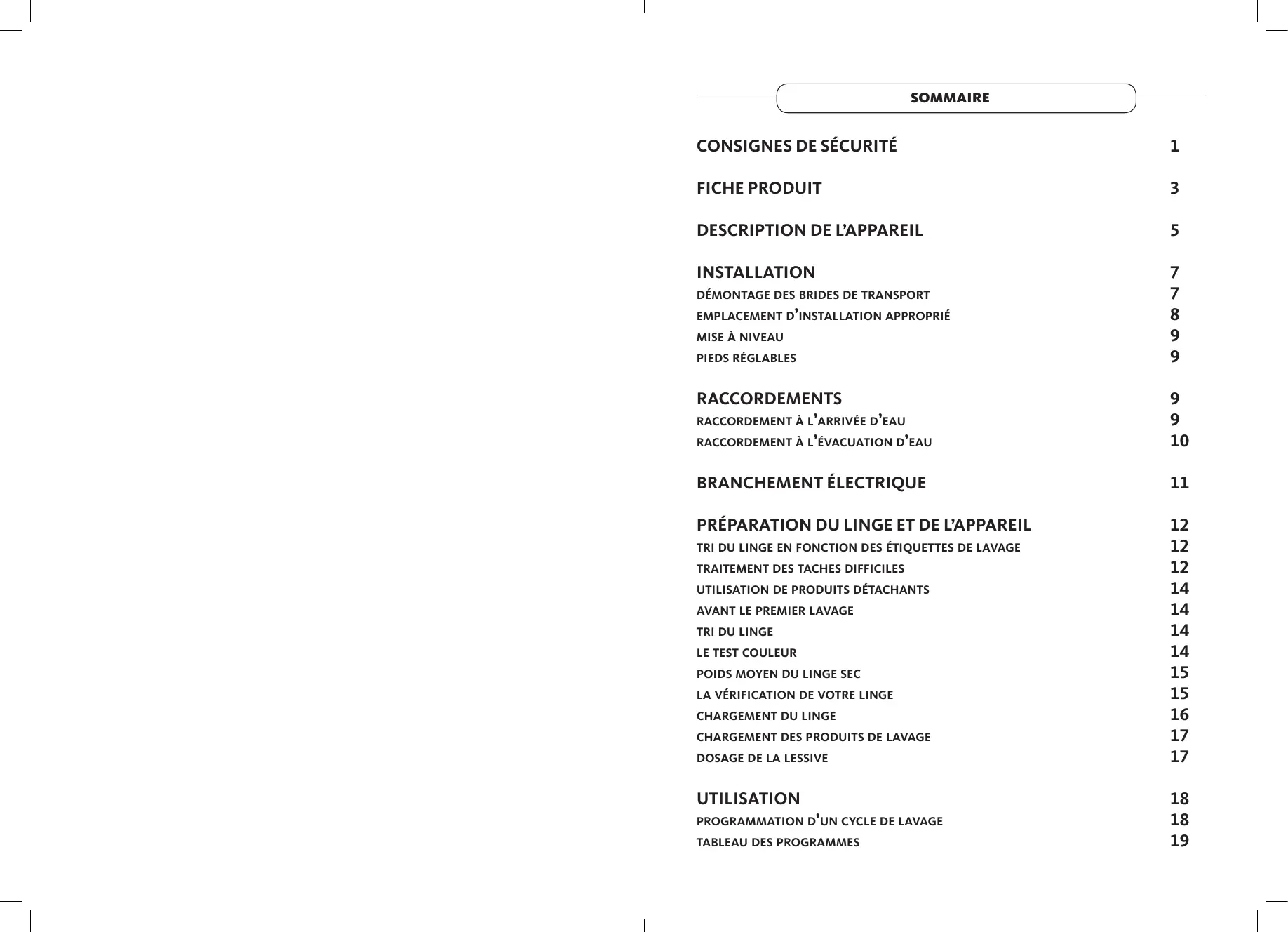 Notice d’utilisation Lave-linge top LT 1000-4 SOMMAIRE consignes de sécurité 1 fiche produit 3 description de l’appareil 5 installation 7 démontage des brides de transport emplacement d’installation approprié mise à niveau pieds réglables raccordements 9 raccordement à l’arrivée d’eau raccordement à l’évacuation d’eau branchement électrique 11 préparation du linge et de l’appareil tri du linge en fonction des étiquettes de lavage traitement des taches difficiles utilisation de produits détachants avant le premier lavage tri du linge le test couleur poids moyen du linge sec la vérification de votre linge chargement du linge chargement des produits de lavage dosage de la lessive