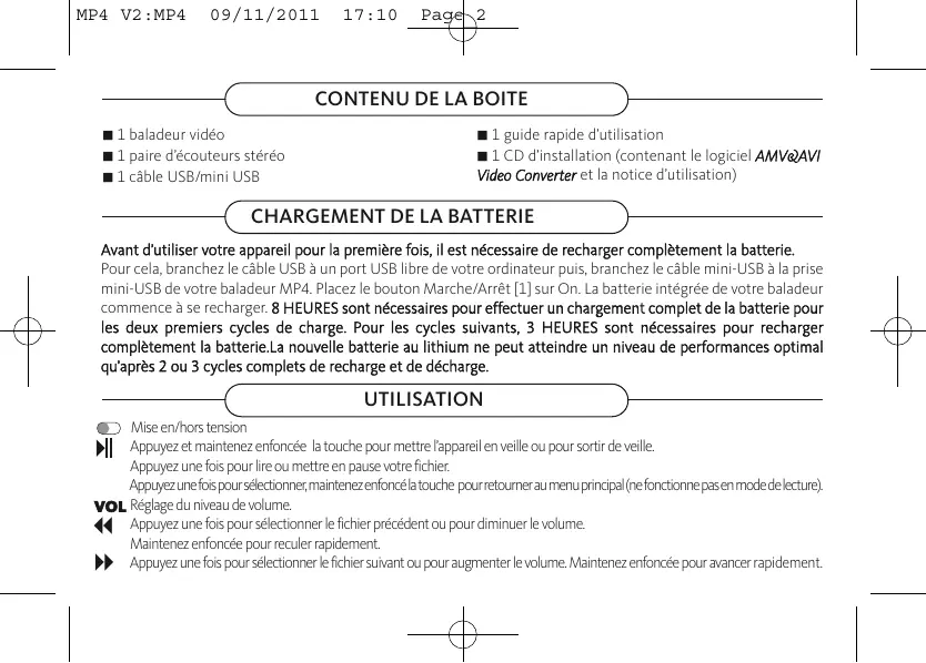 Avant d'utiliser votre apparéil pour la première fois, il est nécessaire de recharger complètement la batterie. Pour cela, branche le cable USB à un port USB libre de votre ordinateur puis, branche le cable mini-USB à la prise mini-USB de votre baladeur MP4. Placez le bouton Marche/Arrêt [1] sur On. La batterie intégrée de votre baladeur commence à se recharger. 8 HEURES sont nécessaires pour effectuer un changement complet de la batterie pour des deux premiers cycles de charge. Pour les cycles suivants, 3 HEURES sont nécessaires pour recharger complètement la batterie. La nouvelle batterie au lithium ne peut atteindre un niveau de performances optimal qu'après 2 ou 3 cycles complets de recharge et de décharge.