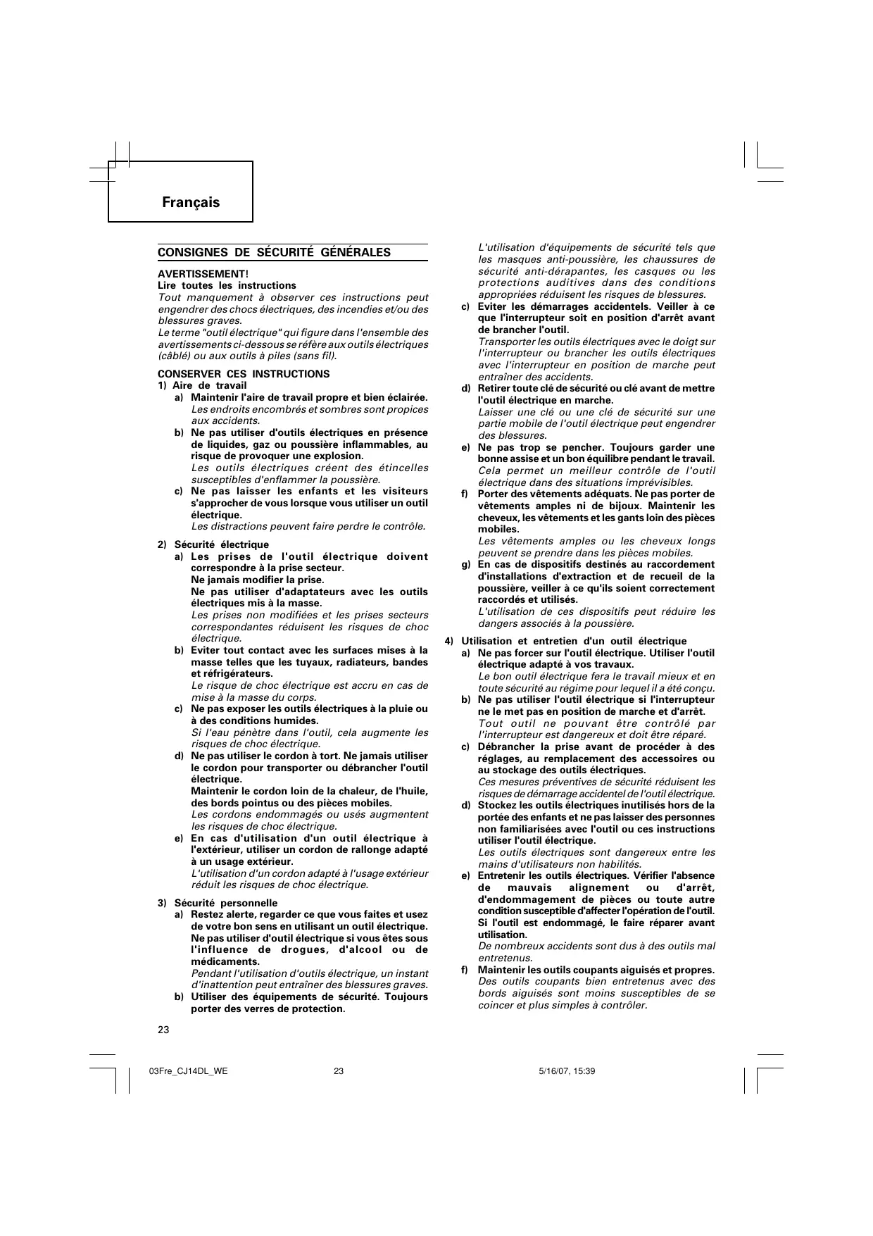 5/16/07, 15:39 Français CONSIGNES DE SÉCURITÉ GÉNÉRALES AVERTISSEMENT! Lire toutes les instructions Tout manquement à observer ces instructions peut engendrer des chocs électriques, des incendies et/ou des blessures graves. Le terme "outil électrique" qui figure dans l'ensemble des avertissements ci-dessous se réfère aux outils électriques (câblé) ou aux outils à piles (sans fil).