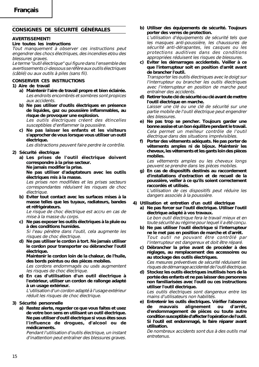 a) Ne pas forcer sur l'outil électrique. Utiliser l'outil électrique adapté à vos travaux. Le bon outil électrique fera le travail mieux et en toute sécurité au régime pour lequel il a été conçu. b) Ne pas utiliser l'outil électrique si l'interrupteur ne le met pas en position de marche et d'arrêt. Tout outil ne pouvant être contrôlé par l'interrupteur est dangereux et doit être réparé. c) Débrancher la prise avant de procéder à des réglages, au remplacement des accessoires ou au stockage des outils électriques. Ces mesures préventives de sécurité réduisent les risques de démarrage accidentel de l'outil électrique. d) Stockez les outils électriques inutilisés hors de la portée des enfants et ne pas laisser des personnes non familiarisées avec l'outil ou ces instructions utiliser l'outil électrique. Les outils électriques sont dangereux entre les mains d'utilisateurs non habilités. e) Entretenir les outils électriques. Vérifier l'absence mauvais alignement d'arrêt, d'endommagement de pièces ou toute autre condition susceptible d'affecter l'opération de l'outil. Si l'outil est endommagé, le faire réparer avant utilisation. De nombreux accidents sont dus à des outils mal entretenus. Français f) Maintenir les outils coupants aiguisés et propres. Des outils coupants bien entretenus avec des bords aiguisés sont moins susceptibles de se coincer et plus simples à contrôler. g) Utiliser l'outil électrique, les accessoires et les mèches de l'outil, etc. conformément à ces instructions et de la manière destinée pour le type précis d'outil électrique, en tenant compte des conditions d'utilisation et du travail à réaliser. L'utilisation de l'outil électrique pour des opérations différentes de celles pour lesquelles il a été conçu est dangereuse.