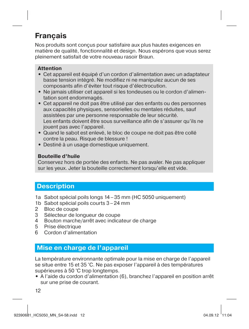 Français Nos produits sont conçus pour satisfaire aux plus hautes exigences en matière de qualité, fonctionnalité et design. Nous espérons que vous serez pleinement satisfait de votre nouveau rasoir Braun. Attention • Cet appareil est équipé d’un cordon d’alimentation avec un adaptateur basse tension intégré. Ne modifiez ni ne manipulez aucun de ses composants afin d’éviter tout risque d’électrocution. • Ne jamais utiliser cet appareil si les tondeuses ou le cordon d’alimentation sont endommagés. • Cet appareil ne doit pas être utilisé par des enfants ou des personnes aux capacités physiques, sensorielles ou mentales réduites, sauf assistées par une personne responsable de leur sécurité. Les enfants doivent être sous surveillance afin de s’assurer qu’ils ne jouent pas avec l’appareil. • Quand le sabot est enlevé, le bloc de coupe ne doit pas être collé contre la peau. Risque de blessure ! • Destiné à un usage domestique uniquement. Bouteille d’huile Conservez hors de portée des enfants. Ne pas avaler. Ne pas appliquer sur les yeux. Jeter la bouteille correctement lorsqu’elle est vide.