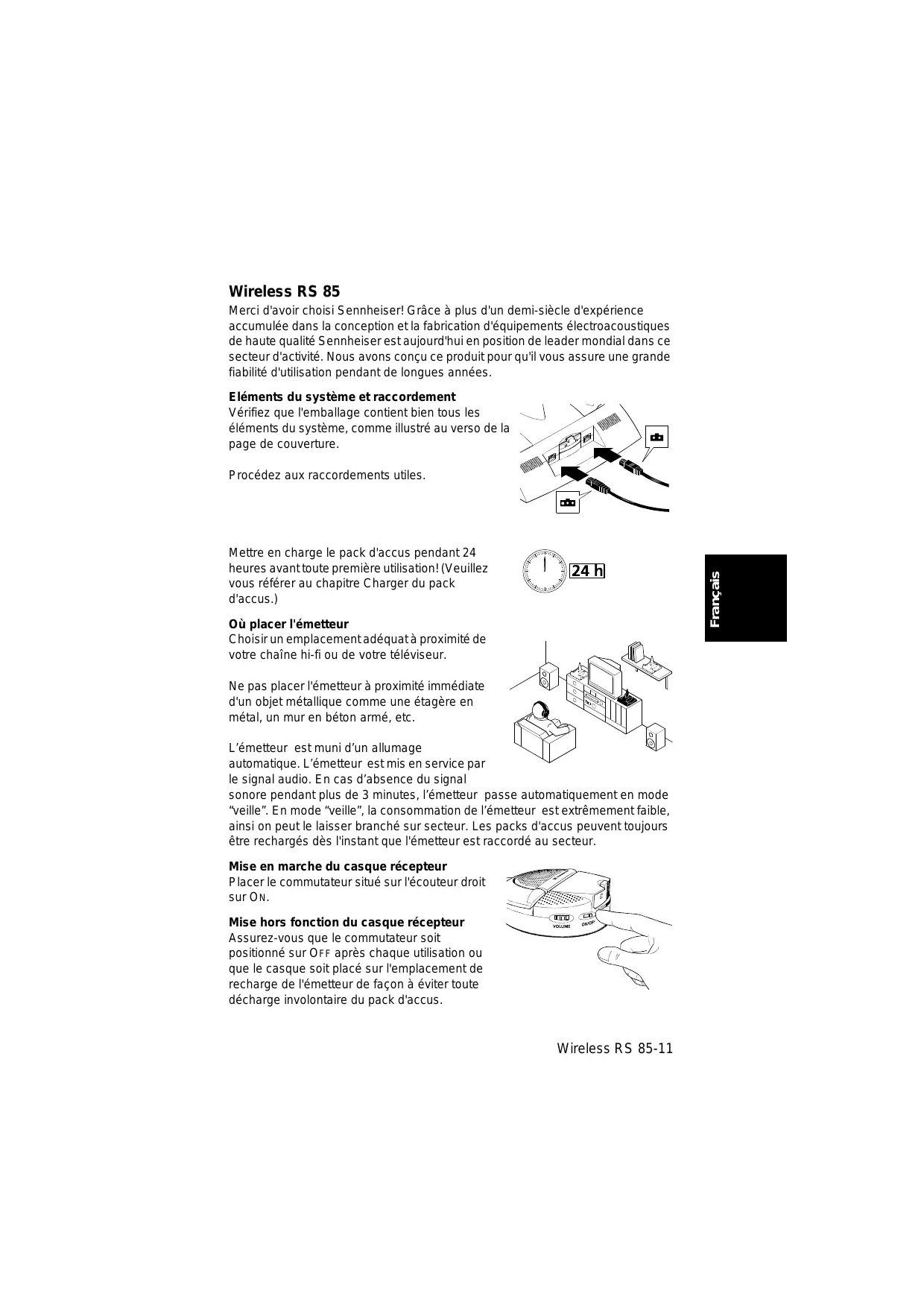 Wireless RS 85 Merci d'avoir choisi Sennheiser! Grâce à plus d'un demi-siècle d'expérience accumulée dans la conception et la fabrication d'équipements électroacoustiques de haute qualité Sennheiser est aujourd'hui en position de leader mondial dans ce secteur d'activité. Nous avons conçu ce produit pour qu'il vous assure une grande fiabilité d'utilisation pendant de longues années. Eléments du système et raccordement Vérifiez que l'emballage contient bien tous les éléments du système, comme illustré au verso de la page de couverture. Procédez aux raccordements utiles. Mettre en charge le pack d'accus pendant 24 heures avanttoute première utilisation! (Veuillez vous référer au chapitre Charger du pack d'accus.) Où placer l'émetteur Choisir un emplacement adéquat à proximité de votre chaîne hi-fi ou de votre téléviseur. Ne pas placer l'émetteur à proximité immédiate d'un objet métallique comme une étagère en métal, un mur en béton armé, etc. L'émetteur est muni d'un allumage automatique. L'émetteur est mis en service par le signal audio. En cas d'absence du signal sonore pendant plus de 3 minutes, l'émetteur passe automatiquement en mode “veille”. En mode “veille”, la consommation de l'émetteur est extrêmement faible, ainsi on peut le laisser branché sur secteur. Les packs d'accus peuvent toujours être rechargés dès l'instant que l'émetteur est raccordé au secteur. Mise en marche du casque récepteur Placer le commutateur situé sur l'écouteur droit surOn Mise hors fonction du casque récepteur Assurez-vous que le commutateur soit positionné sur OFF après chaque utilisation ou que le casque soit placé sur l'emplacement de recharge de l'émetteur de façon à éviter toute décharge involontaire du pack d'accus. Wireless RS 85-11 Français