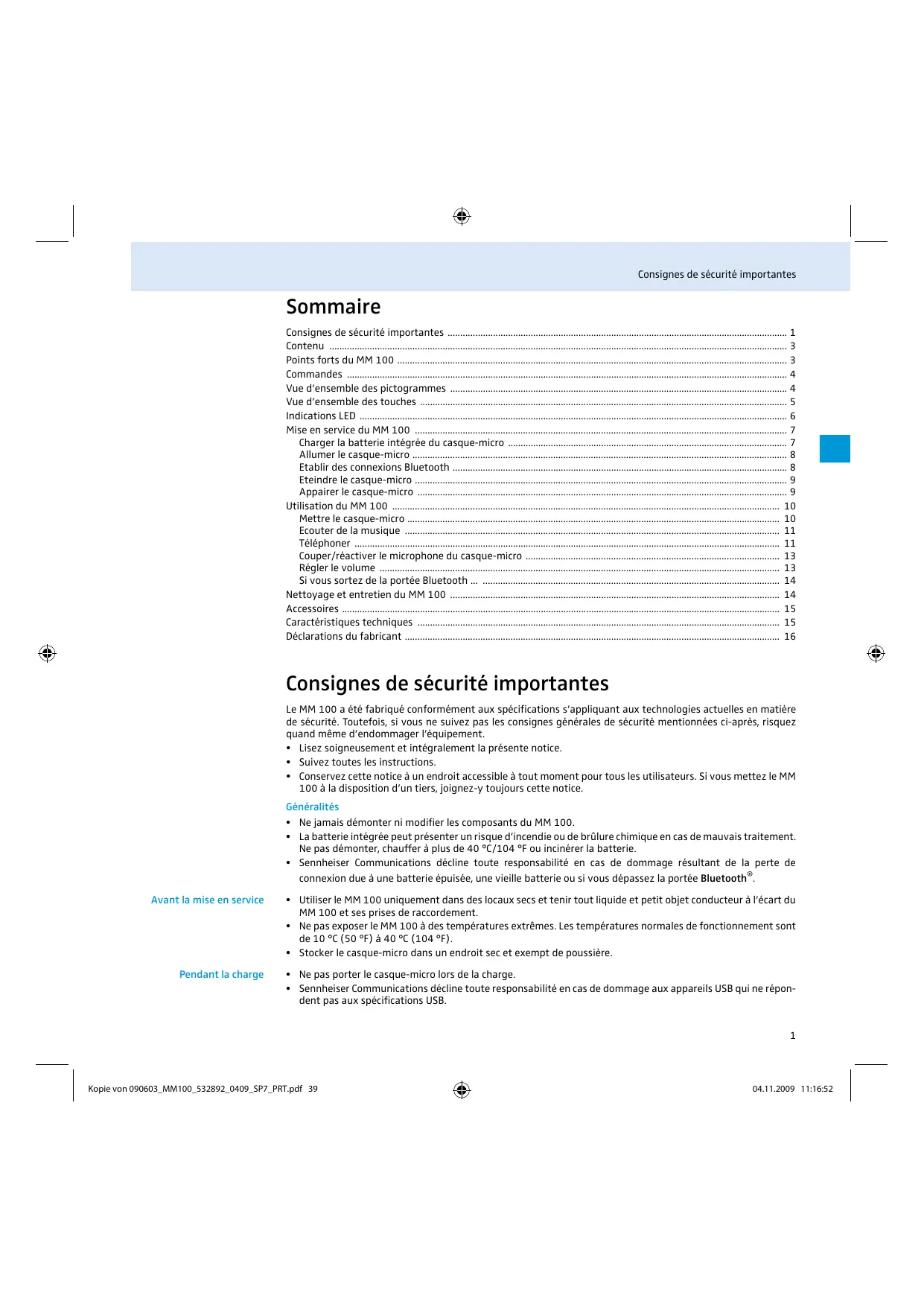 - Déclarations du fabricant Consignes de sécurité importantes Le MM 100 a été fabriqué conformément aux spécifications s’appliquant aux technologies actuelles en matière de sécurité. Toutefois, si vous ne suivez pas les consignes générales de sécurité mentionnées ci-après, risquez quand même d’endommager l’équipement. p. 16