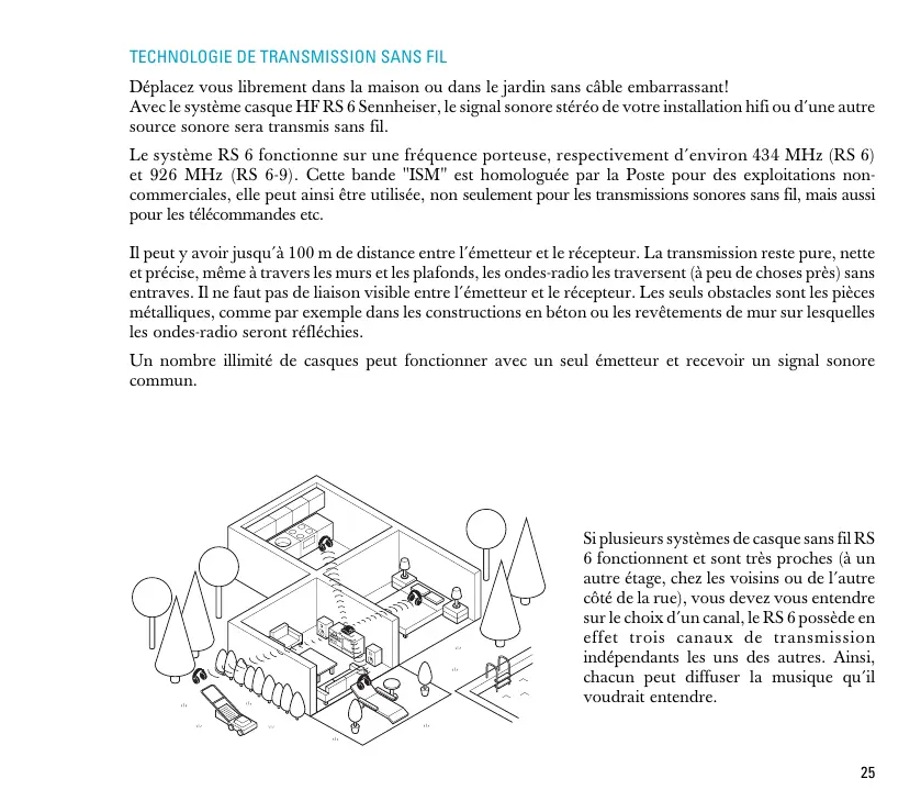 Déplacez vous librement dans la maison ou dans le jardin sans câble embarrassant! Avec le système casque HF RS 6 Sennheiser, le signal sonore stéréo de votre installation hifi ou d´une autre source sonore sera transmis sans fil. Le système RS 6 fonctionne sur une fréquence porteuse, respectivement d´environ 434 MHz (RS 6) et 926 MHz (RS 6-9). Cette bande "ISM" est homologuée par la Poste pour des exploitations noncommerciales, elle peut ainsi être utilisée, non seulement pour les transmissions sonores sans fil, mais aussi pour les télécommandes etc. Il peut y avoir jusqu´à 100 m de distance entre l´émetteur et le récepteur. La transmission reste pure, nette et précise, même à travers les murs et les plafonds, les ondes-radio les traversent (à peu de choses près) sans entraves. Il ne faut pas de liaison visible entre l´émetteur et le récepteur. Les seuls obstacles sont les pièces métalliques, comme par exemple dans les constructions en béton ou les revêtements de mur sur lesquelles les ondes-radio seront réfléchies. Un nombre illimité de casques peut fonctionner avec un seul émetteur et recevoir un signal sonore commun. Si plusieurs systèmes de casque sans fil RS 6 fonctionnent et sont très proches (à un autre étage, chez les voisins ou de l´autre côté de la rue), vous devez vous entendre sur le choix d´un canal, le RS 6 possède en effet trois canaux de transmission indépendants les uns des autres. Ainsi, chacun peut diffuser la musique qu´il voudrait entendre.