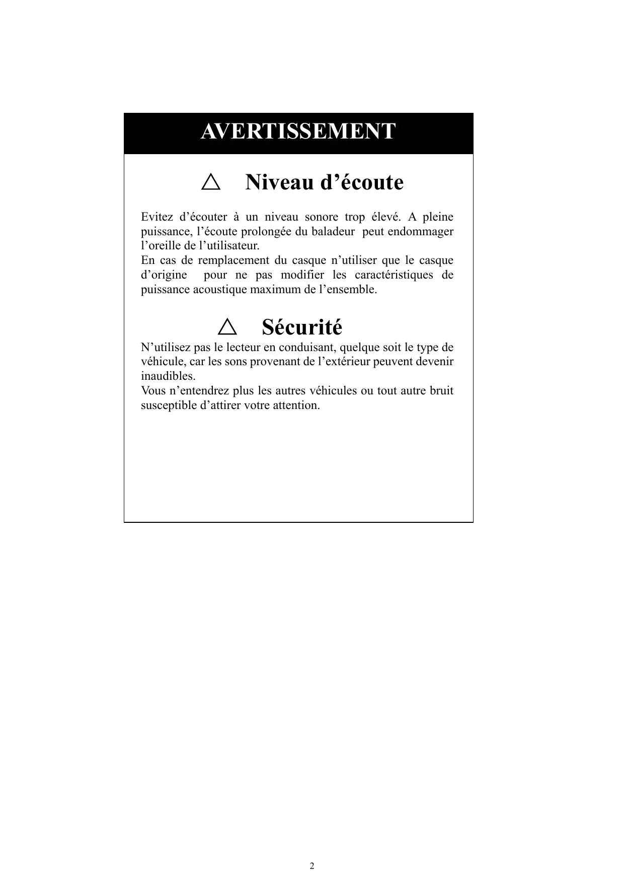 AVERTISSEMENT A Niveau d’écoute Evitez d’écouter à un niveau sonore trop élevé. A pleine puissance, l’écoute prolongée du baladeur peut endommager l'oreille de l’utilisateur. En cas de remplacement du casque n’utiliser que le casque d’origine pour ne pas modifier les caractéristiques de puissance acoustique maximum de l’ensemble. A Sécurité N'utilisez pas le lecteur en conduisant, quelque soit le type de véhicule, car les sons provenant de l’extérieur peuvent devenir inaudibles. Vous n’entendrez plus les autres véhicules ou tout autre bruit susceptible d’attirer votre attention.