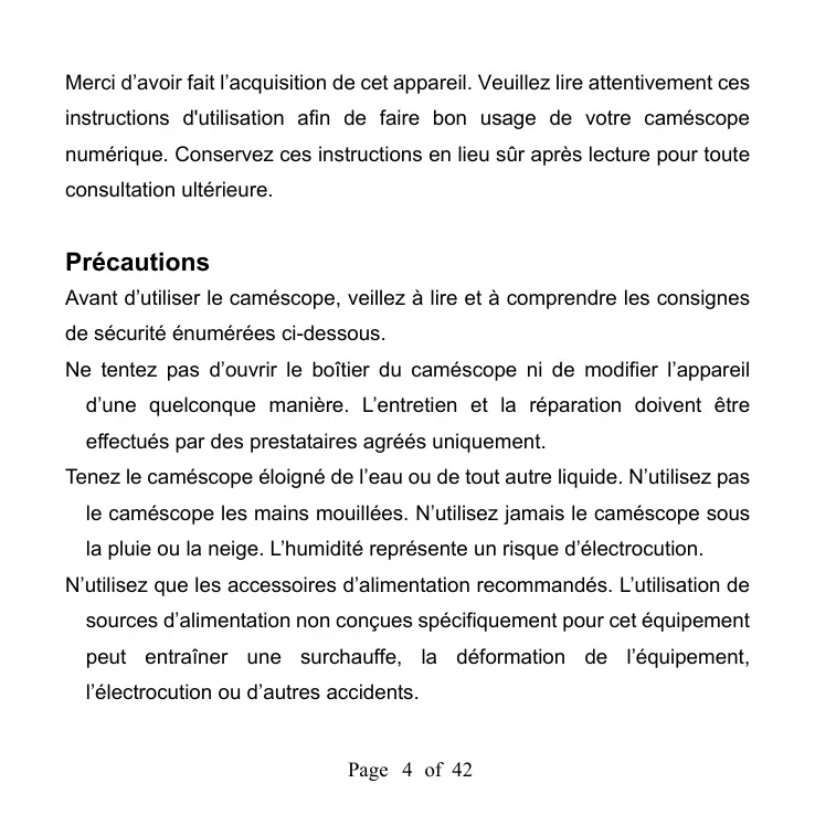 Page 3 of 42 Merci d’avoir fait l’acquisition de cet appareil. Veuillez lire attentivement ces instructions d'utilisation afin de faire bon usage de votre caméscope numérique. Conservez ces instructions en lieu sûr après lecture pour toute consultation ultérieure. Précautions Avant d’utiliser le caméscope, veillez à lire et à comprendre les consignes de sécurité énumérées ci-dessous. Ne tentez pas d’ouvrir le boîtier du caméscope ni de modifier l’appareil d’une quelconque manière. L’entretien et la réparation doivent être effectués par des prestataires agréés uniquement. Tenez le caméscope éloigné de l’eau ou de tout autre liquide. N’utilisez pas le caméscope les mains mouillées. N’utilisez jamais le caméscope sous la pluie ou la neige. L’humidité représente un risque d’électrocution. N’utilisez que les accessoires d’alimentation recommandés. L’utilisation de sources d’alimentation non conçues spécifiquement pour cet équipement peut entraîner une surchauffe, la déformation de l’équipement, l’électrocution ou d’autres accidents. Page 4 of 42