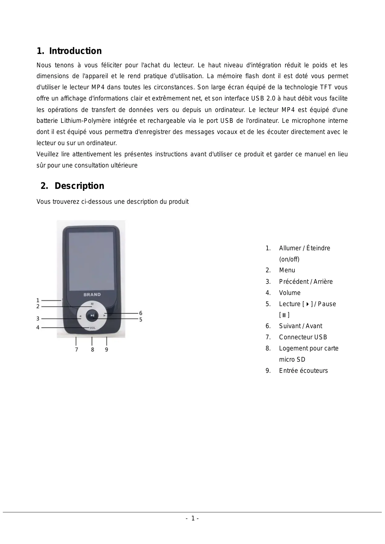 Nous tenons à vous féliciter pour l'achat du lecteur. Le haut niveau d'intégration réduit le poids et les dimensions de l'appareil et le rend pratique d’utilisation. La mémoire flash dont il est doté vous permet d'utiliser le lecteur MP4 dans toutes les circonstances. Son large écran équipé de la technologie TFT vous offre un affichage d'informations clair et extrêmement net, et son interface USB 2.0 à haut débit vous facilite les opérations de transfert de données vers ou depuis un ordinateur. Le lecteur MP4 est équipé d'une batterie Lithium-Polymère intégrée et rechargeable via le port USB de l'ordinateur. Le microphone interne dont il est équipé vous permettra d'enregistrer des messages vocaux et de les écouter directement avec le lecteur ou sur un ordinateur. Veuillez lire attentivement les présentes instructions avant d'utiliser ce produit et garder ce manuel en lieu sûr pour une consultation ultérieure