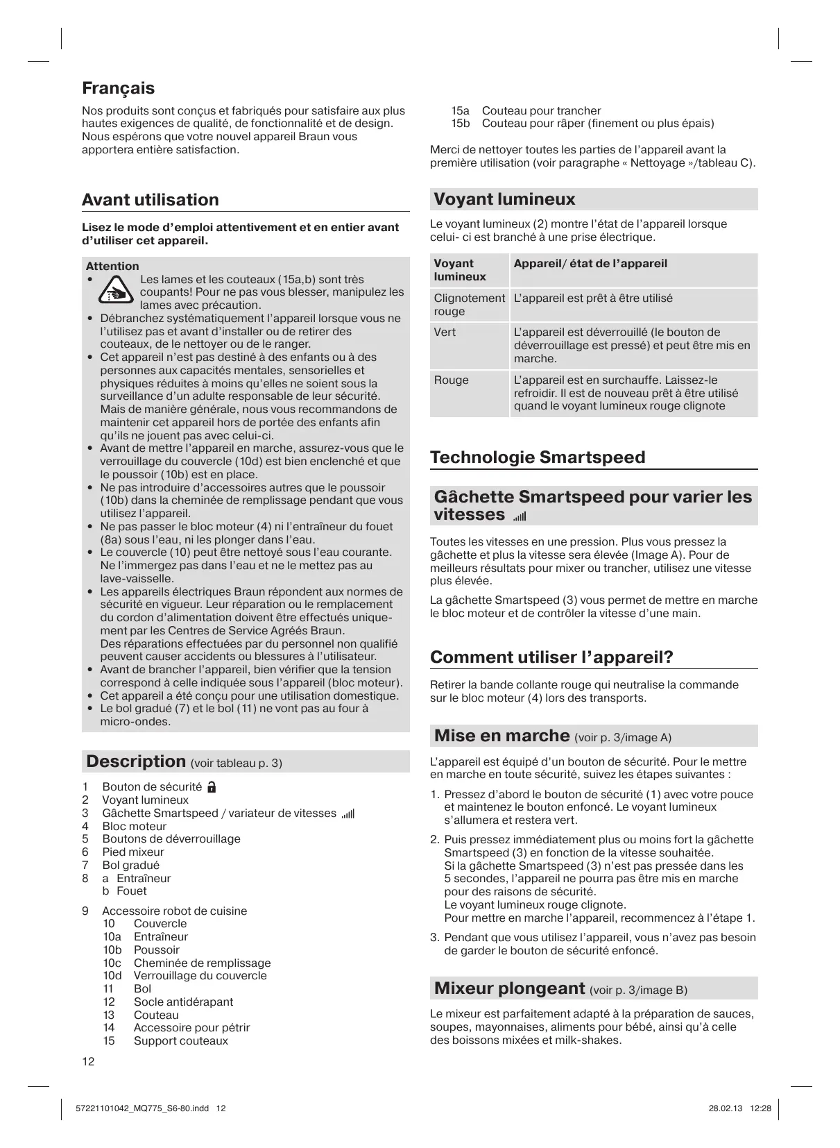Français Nos produits sont conçus et fabriqués pour satisfaire aux plus hautes exigences de qualité, de fonctionnalité et de design. Nous espérons que votre nouvel appareil Braun vous apportera entière satisfaction. Avant utilisation Lisez le mode d’emploi attentivement et en entier avant d’utiliser cet appareil. Attention Les lames et les couteaux (15a,b) sont très coupants! Pour ne pas vous blesser, manipulez les lames avec précaution.