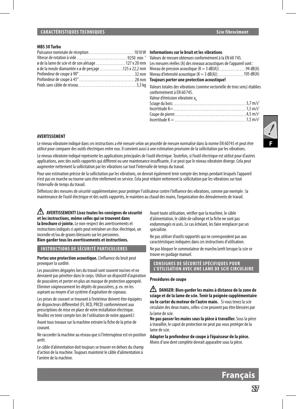 CARACT ISTIQUES TECHNIQUES MBS 30 Turbo Puissance nominale de réception 1010W Vitesse de rotation à vide . 9250 min * 9 de la lame de sci et de son alésage 127120 mm 9 de la meule diamantée x 0 de perçage 225x22,2mm Profondeur de coupe à 90°. 32mm Profondeur de coupe à 45°... 28mm Poids sans câble de réseau 33kg AVERTISSEMENT Informations sur le bruit et les vibrations Valeurs de mesure obtenues conformément à la EN 60 745. Les mesures réelles (A) des niveaux acoustiques de l'appareil sont Niveau de pression acoustique (K = 3 dB(A)) 94 dB(A) Niveau d'intensité acoustique (K = 3 dB(A)).… 105 dB) Toujours porter une protection acoustique! Valeurs totales des vibrations (somme vectorielle de trois sens) établies conformément à EN 60745. Valeur d'émission vibratoire 3, Sciage du bois: 37m incertitude K= 15 m/s Coupe de pierre: 45m Incertitude K = 15 m/s Le niveau vibratoie indiqué dans ces instructions a été mesuré selon un procédé de mesure normalisé dans la norme EN 60745 et peut être utilisé pour comparer des outils électriques entre eux I convient aussi à une estimation provisoire de la sollicitation par es vibrations. Le niveau vibratoire indiqué représente les applications principales de l'outil électrique. Toutefois si lutil électrique est utilisé pour d'autres applications avec des outils rapportés qui diffèrent ou une maintenance insuffisante, se peut que le niveau vibratoie verge. Cela peut augmenter nettement la sollicitation par les vibrations sur tout l'intervalle de temps du travail. Pour une estimation précise de la sollicitation parles vibrations, on devrait également tenir compte des temps pendant lesquels l'appareil n'est pas en marche ou tourne sans être réellement en service. Cela peut réduire nettement la sollicitation par les vibrations sur tout l'intervalle de temps du travail Définissez des mesures de sécurité supplémentaires pour protéger l'utilisateur contre l'fluence des vibrations, comme par exemple: là maintenance de l'outil électrique et des outils rapportés, le maintien au chaud des mains l'organisation des déroulements de travail. À avERTISSEMENT: Lisez toutes les consignes de sécurité etles instructions, même celles qui se trouvent dans la brochure d-jointe. Le non-respect des avertissements et instructions indiqués ci après peut entraîner un choc électrique, un incendie et/ou de graves blessures sur les personnes. Bien garder tous les avertissements et instructions.