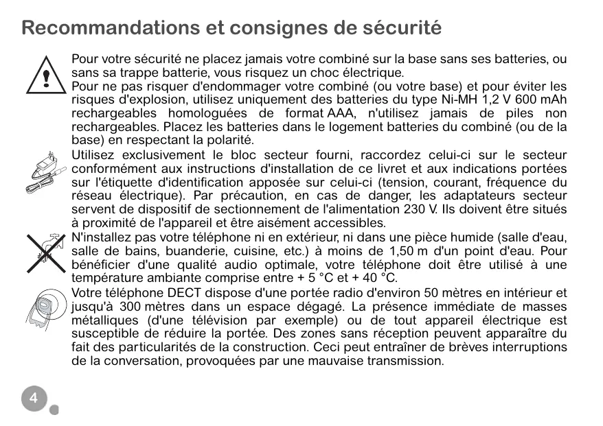 Recommandations et consignes de sécurité Pour votre sécurité ne placez jamais votre combiné sur la base sans ses batteries, ou sans sa trappe batterie, vous risquez un choc électrique. Pour ne pas risquer d'endommager votre combiné (ou votre base) et pour éviter les risques d'explosion, utilisez uniquement des batteries du type Ni-MH 1,2 V 600 mAh rechargeables homologuées de format AAA, n'utilisez jamais de piles non rechargeables. Placez les batteries dans le logement batteries du combiné (ou de la base) en respectant la polarité. Utilisez exclusivement le bloc secteur fourni, raccordez celui-ci sur le secteur conformément aux instructions d'installation de ce livret et aux indications portées sur l'étiquette d'identification apposée sur celui-ci (tension, courant, fréquence du réseau électrique). Par précaution, en cas de danger, les adaptateurs secteur servent de dispositif de sectionnement de l'alimentation 230 V. Ils doivent être situés à proximité de l'appareil et être aisément accessibles. N'installez pas votre téléphone ni en extérieur, ni dans une pièce humide (salle d'eau, salle de bains, buanderie, cuisine, etc.) à moins de 1,50 m d'un point d'eau. Pour bénéficier d'une qualité audio optimale, votre téléphone doit être utilisé à une température ambiante comprise entre + 5 °C et + 40 °C. Votre téléphone DECT dispose d'une portée radio d'environ 50 mètres en intérieur et jusqu'à 300 mètres dans un espace dégagé. La présence immédiate de masses métalliques (d'une télévision par exemple) ou de tout appareil électrique est susceptible de réduire la portée. Des zones sans réception peuvent apparaître du fait des particularités de la construction. Ceci peut entraîner de brèves interruptions de la conversation, provoquées par une mauvaise transmission.
