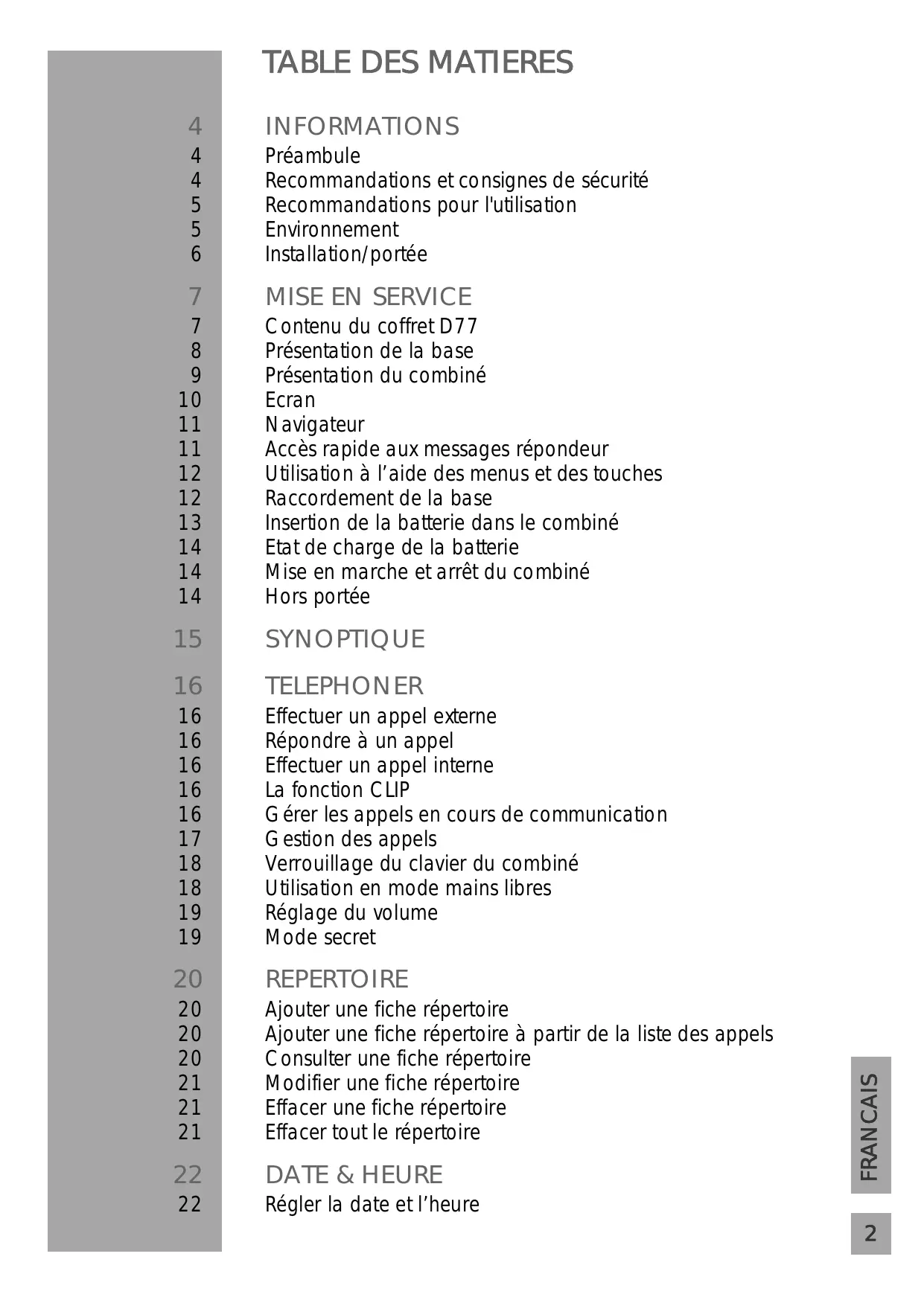 Contenu du coffret D77 Présentation de la base Présentation du combiné Ecran Navigateur Accès rapide aux messages répondeur Utilisation à l’aide des menus et des touches Raccordement de la base Insertion de la batterie dans le combiné Etat de charge de la batterie Mise en marche et arrêt du combiné Hors portée
