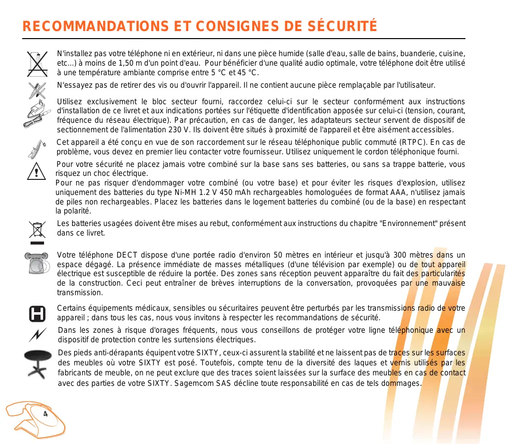 N'installez pas votre téléphone ni en extérieur, ni dans une pièce humide (salle d'eau, salle de bains, buanderie, cuisine, etc...) à moins de 1,50 m d'un point d'eau. Pour bénéficier d'une qualité audio optimale, votre téléphone doit être utilisé à une température ambiante comprise entre 5 °C et 45 °C. N'essayez pas de retirer des vis ou d'ouvrir l'appareil. Il ne contient aucune pièce remplaçable par l'utilisateur. Utilisez exclusivement le bloc secteur fourni, raccordez celui-ci sur le secteur conformément aux instructions d'installation de ce livret et aux indications portées sur l'étiquette d'identification apposée sur celui-ci (tension, courant, fréquence du réseau électrique). Par précaution, en cas de danger, les adaptateurs secteur servent de dispositif de sectionnement de l'alimentation 230 V. Ils doivent être situés à proximité de l'appareil et être aisément accessibles. Cet appareil a été conçu en vue de son raccordement sur le réseau téléphonique public commuté (RTPC). En cas de problème, vous devez en premier lieu contacter votre fournisseur. Utilisez uniquement le cordon téléphonique fourni. Pour votre sécurité ne placez jamais votre combiné sur la base sans ses batteries, ou sans sa trappe batterie, vous risquez un choc électrique. Pour ne pas risquer d'endommager votre combiné (ou votre base) et pour éviter les risques d'explosion, utilisez uniquement des batteries du type Ni-MH 1.2 V 450 mAh rechargeables homologuées de format AAA, n'utilisez jamais de piles non rechargeables. Placez les batteries dans le logement batteries du combiné (ou de la base) en respectant la polarité. Les batteries usagées doivent être mises au rebut, conformément aux instructions du chapitre "Environnement" présent dans ce livret. Votre téléphone DECT dispose d'une portée radio d'environ 50 mètres en intérieur et jusqu'à 300 mètres dans un espace dégagé. La présence immédiate de masses métalliques (d'une télévision par exemple) ou de tout appareil électrique est susceptible de réduire la portée. Des zones sans réception peuvent apparaître du fait des particularités de la construction. Ceci peut entraîner de brèves interruptions de la conversation, provoquées par une mauvaise transmission. Certains équipements médicaux, sensibles ou sécuritaires peuvent être perturbés par les transmissions radio de votre appareil ; dans tous les cas, nous vous invitons à respecter les recommandations de sécurité. Dans les zones à risque d'orages fréquents, nous vous conseillons de protéger votre ligne téléphonique avec un dispositif de protection contre les surtensions électriques. Des pieds anti-dérapants équipent votre SIXTY, ceux-ci assurent la stabilité et ne laissent pas de traces sur les surfaces des meubles où votre SIXTY est posé. Toutefois, compte tenu de la diversité des laques et vernis utilisés par les fabricants de meuble, on ne peut exclure que des traces soient laissées sur la surface des meubles en cas de contact avec des parties de votre SIXTY. Sagemcom SAS décline toute responsabilité en cas de tels dommages.