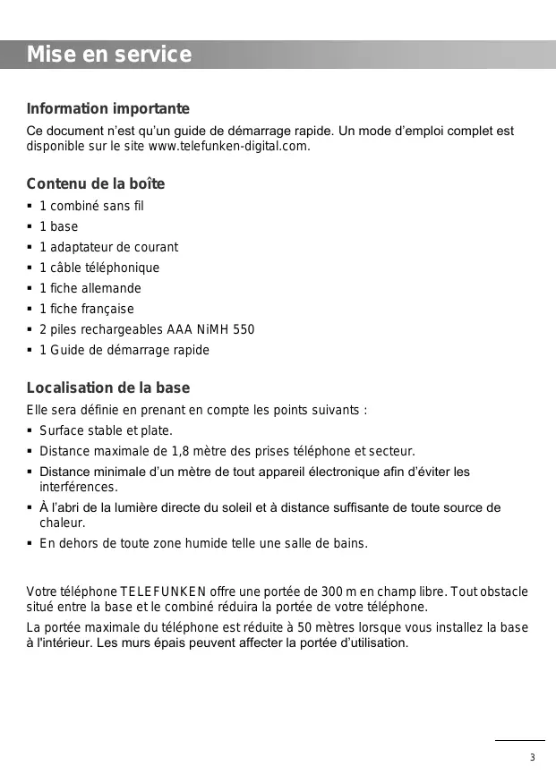 Mise en service Information importante Ce document n‟est qu‟un guide de démarrage rapide. Un mode d‟emploi complet est disponible sur le site www.telefunken-digital.com. Contenu de la boîte 1 combiné sans fil 1 base 1 adaptateur de courant 1 câble téléphonique 1 fiche allemande 1 fiche française 2 piles rechargeables AAA NiMH 550 1 Guide de démarrage rapide Localisation de la base Elle sera définie en prenant en compte les points suivants : Surface stable et plate. Distance maximale de 1,8 mètre des prises téléphone et secteur. Distance minimale d‟un mètre de tout appareil électronique afin d‟éviter les interférences. À l‟abri de la lumière directe du soleil et à distance suffisante de toute source de chaleur. En dehors de toute zone humide telle une salle de bains. Votre téléphone TELEFUNKEN offre une portée de 300 m en champ libre. Tout obstacle situé entre la base et le combiné réduira la portée de votre téléphone. La portée maximale du téléphone est réduite à 50 mètres lorsque vous installez la base à l'intérieur. Les murs épais peuvent affecter la portée d‟utilisation.