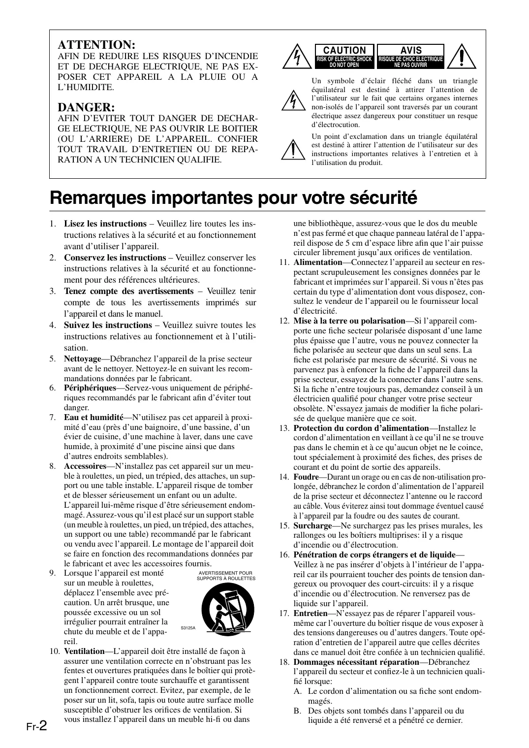 6. Périphériques—Servez-vous uniquement de périphériques recommandés par le fabricant afin d’éviter tout danger. 7. Eau et humidité—N’utilisez pas cet appareil à proximité d’eau (près d’une baignoire, d’une bassine, d’un évier de cuisine, d’une machine à laver, dans une cave humide, à proximité d’une piscine ainsi que dans d’autres endroits semblables). 8. Accessoires—N’installez pas cet appareil sur un meuble à roulettes, un pied, un trépied, des attaches, un support ou une table instable. L’appareil risque de tomber et de blesser sérieusement un enfant ou un adulte. L’appareil lui-même risque d’être sérieusement endommagé. Assurez-vous qu’il est placé sur un support stable (un meuble à roulettes, un pied, un trépied, des attaches, un support ou une table) recommandé par le fabricant ou vendu avec l’appareil. Le montage de l’appareil doit se faire en fonction des recommandations données par le fabricant et avec les accessoires fournis. AVERTISSEMENT POUR 9. Lorsque l’appareil est monté SUPPORTS À ROULETTES sur un meuble à roulettes, déplacez l’ensemble avec précaution. Un arrêt brusque, une poussée excessive ou un sol irrégulier pourrait entraîner la S3125A chute du meuble et de l’appareil. 10. Ventilation—L’appareil doit être installé de façon à assurer une ventilation correcte en n’obstruant pas les fentes et ouvertures pratiquées dans le boîtier qui protègent l’appareil contre toute surchauffe et garantissent un fonctionnement correct. Evitez, par exemple, de le poser sur un lit, sofa, tapis ou toute autre surface molle susceptible d’obstruer les orifices de ventilation. Si vous installez l’appareil dans un meuble hi-fi ou dans