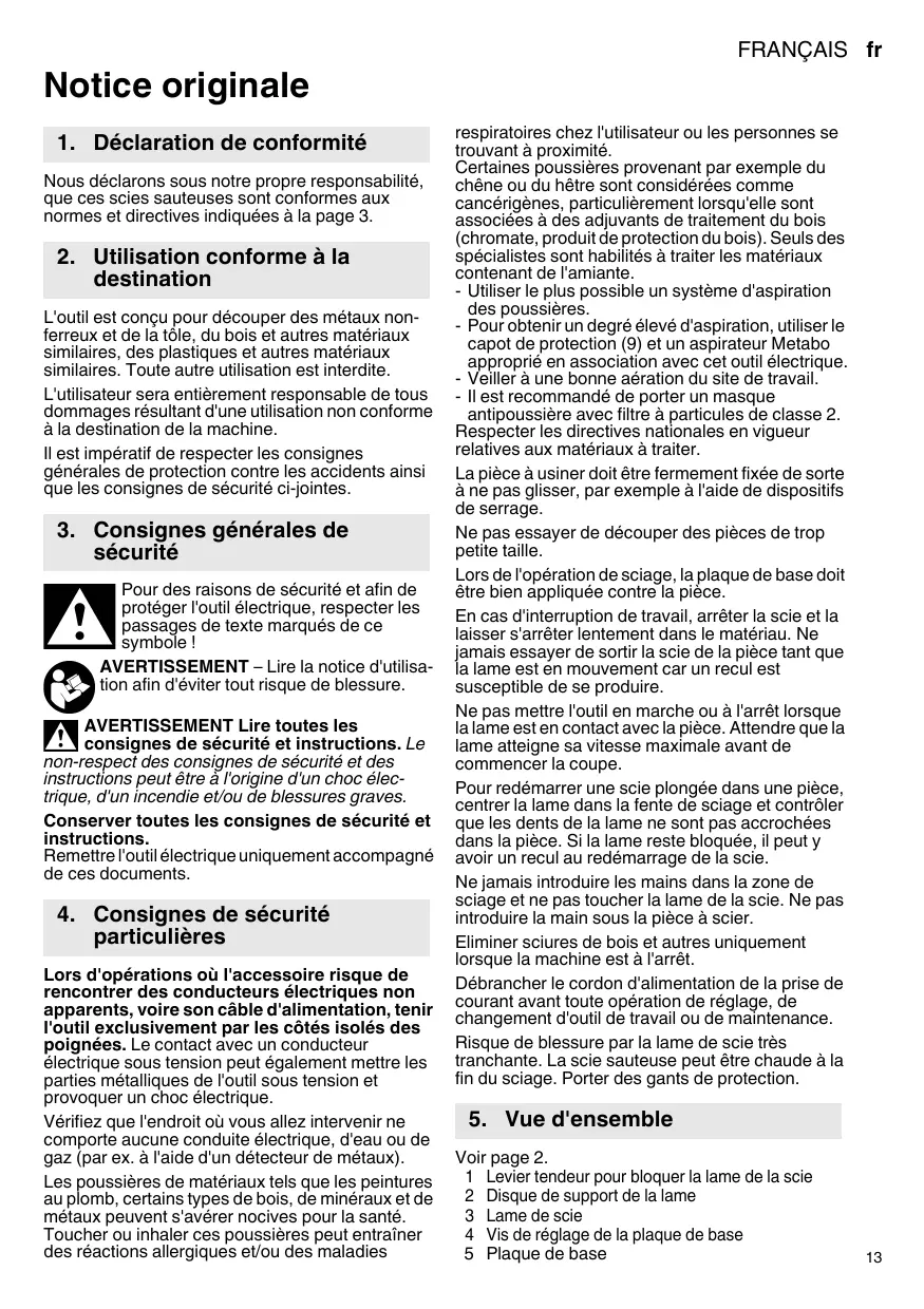 particulières Lors d'opérations où l'accessoire risque de rencontrer des conducteurs électriques non apparents, voire son câble d'alimentation, tenir l'outil exclusivement par les côtés isolés des poignées. Le contact avec un conducteur électrique sous tension peut également mettre les parties métalliques de l'outil sous tension et provoquer un Choc électrique. Vérifiez que l'endroit où vous allez intervenir ne comporte aucune conduite électrique, d'eau ou de gaz (par ex. à l'aide d'un détecteur de métaux). Les poussières de matériaux tels que les peintures au plomb, certains types de bois, de minéraux et de métaux peuvent s'avérer nocives pour la santé. Toucher ou inhaler ces poussières peut entraîner des réactions allergiques evou des maladies FRANÇAIS fr respiratoires chez l'utilisateur ou les personnes se trouvant à proximité. Certaines poussières provenant par exemple du chêne ou du hêtre sont considérées comme cancérigènes, particulièrement lorsqu'elle sont associées à des adjuvants de traitement du bois (chromate, produit de protection du bois). Seuls des spécialistes sont habilités à traiter les matériaux contenant de l'amiante. - Utiliser le plus possible un système d'aspiration des poussières. - Pour obtenir un degré élevé d'aspiration, utiliser le capot de protection (9) et un aspirateur Metabo approprié en association avec cet outil électrique. - Veiller à une bonne aération du site de travail. - ILest recommandé de porter un masque antipoussière avec filtre à particules de classe 2. Respecter les directives nationales en vigueur relatives aux matériaux à traiter. La pièce à usiner doit être fermement fixée de sorte àne pas glisser, par exemple à l'aide de dispositifs de serrage. Ne pas essayer de découper des pièces de trop petite taille. Lors de l'opération de sciage, la plaque de base doit être bien appliquée contre la pièce. En cas d'interruption de travail, arrêter la scie et la laisser s'arrêter lentement dans le matériau. Ne jamais essayer de sortir la scie de la pièce tant que la lame est en mouvement car un recul est susceptible de se produire. Ne pas mettre l'outil en marche ou à l'arrêt lorsque la lame est en contact avec la pièce. Attendre que la lame atteigne sa vitesse maximale avant de commencer la coupe. Pour redémarrer une scie plongée dans une pièce, centrer la lame dans la fente de sciage et contrôler que les dents de la lame ne sont pas accrochées dans la pièce. Si la lame reste bloquée, il peut y avoir un recul au redémarrage de la scie. Ne jamais introduire les mains dans la zone de sciage et ne pas toucher la lame de la scie. Ne pas introduire la main sous la pièce à scier. Eliminer sciures de bois et autres uniquement lorsque la machine est à l'arrêt. Débrancher le cordon d'alimentation de la prise de courant avant toute opération de réglage, de changement d'outil de travail ou de maintenance. Risque de blessure par la lame de scie très tranchante. La scie sauteuse peut être chaude à la fin du sciage. Porter des gants de protection.