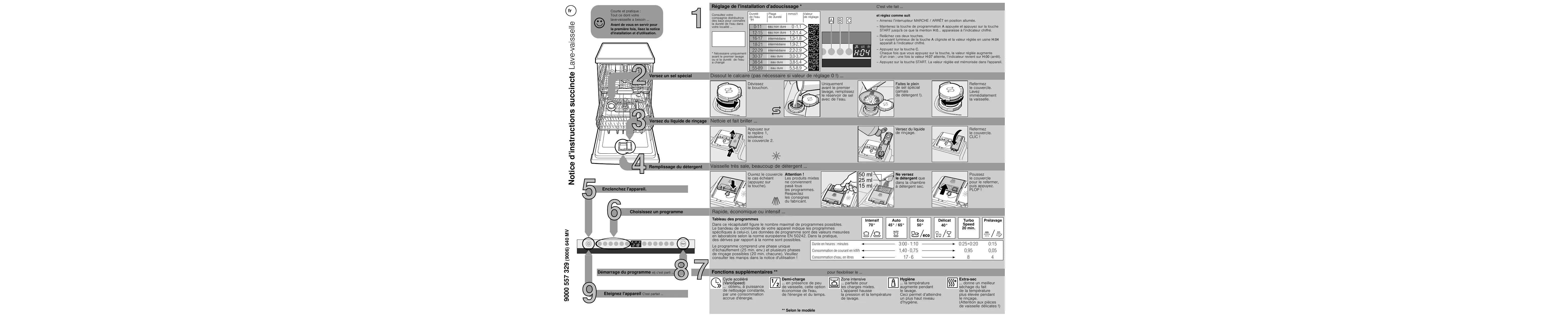 Refermez le couvercle. Lavez immédiatement la vaisselle. Faites le plein de sel spécial (jamais de détergent 1). Appuyez sur le repère 1, soulevez le couvercle 2. Versez du liquide Refermez = | de rinçage. le couvercle. CC ! Ouvrez le couvercle Attention ! le cas échéant Les produits mixtes (appuyez sur ne conviennent la touche). pasà tous les programmes. Respectez les consignes du fabricant. Poussez le couvercle pour le refermer, puis appuyez. PLOP ! Ne versez le détergent que dans la chambre à détergent sec. Tableau des programmes Intensif Auto Eco Turbo Prélavage Dans ce récapitulatif figure le nombre maximal de programmes possibles. 70° 45° /65° 50° Speed Le bandeau de commande de votre apparell indique Iés programmes nu 20 min. spécifiques à celui-ci. Les données de programme sont des valeurs mesurées go VE en laboratoire selon la norme européenne EN 50242. Dans la pratique, S/S Ë te / eco] [Va / T ti / / des dérives par rapport à la norme sont possibles. Le programme comprend une phase unique Durée en heures : minutes 3:00-1:10 0:25+0:20 0:15 d'échauffement (25 min. env.) et plusieurs phases Consommation de courant en kWh 1,40-0,75 0,95 0,05 de rinçage possibles (20 min. chacune). Veuillez . consulter les manips dans la notice d'utilisation ! Consommation d'eau, en litres 176 — , 8 nl EN Gycl accéléré Demi-charge D] Zone intensive Hygiène | | Extra-sec (VarioSpeed)_… … en présence de peu | }|… parfaite pour â …l@ température (S* | donne un meiteur D … obtenu, à puissance de vaisselle, cette option lies charges mixtes. augmente pendant séchage du fait économise de l'eau, de nettoyage constante, de l'énergie et du temps. par une consommation acorue d'énergie. L'appareil hausse de lavage. ** Selon le modèle la pression et la température le lavage. de la température Ceci permet d'atteindre plus élevée pendant un plus haut niveau le rinçage. d'hygiène. {Attention aux pièces de vaisselle délicates !)