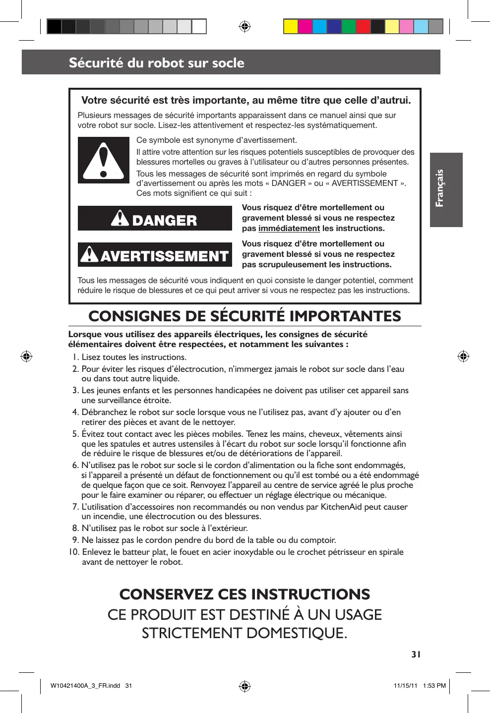 CONSERVEZ CES INSTRUCTIONS CE PRODUIT EST DESTINÉ À UN USAGE STRICTEMENT DOMESTIQUE.