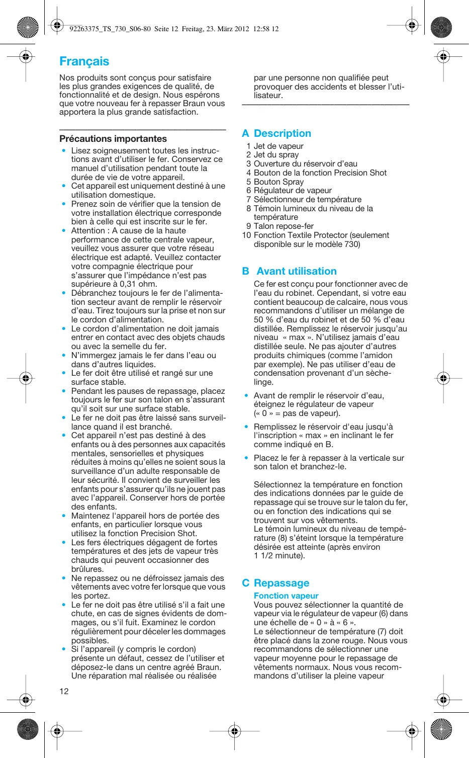 - Placez le fer à repasser à la verticale sur son talon et branchez-le. Sélectionnez la température en fonction des indications données par le guide de repassage qui se trouve sur le talon du fer, ou en fonction des indications qui se trouvent sur vos vêtements. Le témoin lumineux du niveau de température (8) s’éteint lorsque la température désirée est atteinte (après environ 1 1/2 minute). C Repassage Fonction vapeur Vous pouvez sélectionner la quantité de vapeur via le régulateur de vapeur (6) dans une échelle de « 0 » à « 6 ». Le sélectionneur de température (7) doit être placé dans la zone rouge. Nous vous recommandons de sélectionner une vapeur moyenne pour le repassage de vêtements normaux. Nous vous recommandons d’utiliser la pleine vapeur seulement pour les tissus tels que la toile, le coton épais ou autres tissus similaires. Pour information : lors du repassage, ne tournez pas le régulateur de vapeur au delà de « 6 ». Fonction vapeur extrême Pour encore plus de vapeur, appuyez sur le régulateur de vapeur (6) pendant 30 secondes au maximum. Le sélectionneur de température (7) doit être placé dans la zone rouge pleine. Precision Shot Avant l'utilisation, appuyez sur le bouton Precision Shot (4) 3 à 4 fois pour l'activer. Appuyez sur ce bouton avec des intervalles d’au moins 5 secondes afin de profiter d’une puissante pression de vapeur. Precision Shot peut être activé lors du repassage à sec. Cependant, le sélecteur de température doit être dans la zone rouge pleine. La fonction Precision Shot peut également être utilisée en position verticale pour le défroissage de vêtements suspendus. Attention : la vapeur chaude sort du jet de vapeur Precision Shot. Fonction Spray Appuyez sur le bouton Spray (5). Repassage à sec Placez le régulateur de vapeur (6) sur la position « 0 » (= arrêt de la vapeur). D Textile Protector (seulement disponible sur le modèle 730) Avant d’utiliser la fonction Textile Protector, repassez environ 2 minutes sans cette fonction. Textile Protector (10) de Braun protège les tissus délicats des éventuels dommages causés par la chaleur et permet de repasser la plupart des vêtements sombres sans utiliser de tissu intermédiaire. Un revêtement spécial permet d’éviter les zones de brillance. Cependant, lorsque la fonction Textile Protector est enclenchée, pour ne pas endommager ce revêtement, évitez de repasser par exemple sur les fermetures éclair, les boutons en métal, les rivets ou sur tout motif/dessin sur-imprimé. Pour vérifier au préalable les réactions du repassage sur vos vêtements, nous vous recommandons d’effectuer un test en repassant à l’envers une petite surface du vêtement. Avec la fonction Textile Protector, vous pouvez repasser les tissus délicats en réglant la température sur la zone rouge pleine de manière à pouvoir utiliser toutes les fonctions vapeur que vous offre votre fer. Après avoir activé la fonction Textile Protector, attendez environ 1 1/2 minute avant de commencer à repasser. Rangez toujours votre fer en ayant pris soin de désactiver la fonction Textile Protector. E Après le repassage Débranchez le fer et tournez le régulateur de vapeur sur la position « 0 ». Pour prolonger la vie du fer, videz le réservoir d'eau. Rangez le fer froid dans un endroit sec sur son talon. F Entretien et nettoyage Utilisez de la laine d’acier pour nettoyer la semelle. N’utilisez jamais de tampon à récurer, de vinaigre ou tout autres produits chimiques. G Nettoyage de la tige anti-calcaire La tige anti-calcaire qui se trouve sur le régulateur de vapeur doit être détartrée régulièrement (c’est-à-dire à chaque fois que le débit de vapeur est insuffisant). Pour ce nettoyage, le réservoir d’eau doit être vidé. Nettoyage de la tige anti-calcaire : Tournez le régulateur de vapeur dans le sens des aiguilles d’une montre jusqu'à la position « 6 ». Continuez à tourner fermement au delà de la résistance jusqu'à ce que le régulateur de vapeur soit soulevé. Une fois placée sur x tirez-le verticalement. Ne touchez pas la partie basse de la tige anti-calcaire. Immergez la dans du vinaigre (pas d’essence de vinaigre) ou du jus de citron pendant une durée de 30 minutes minimum. Frottez les résidus restants et rincez la tige sous l'eau (fig. G 1–7). Réinstallation du régulateur de vapeur : Lors de la réinstallation du régulateur de vapeur, assurez-vous qu’il soit toujours orienté sur x (fig. G 8). Refermez fermement le régulateur de vapeur jusqu'à ce qu'il soit positionné sur « 6 ». Pour information : le fer ne doit jamais être utilisé sans la présence du régulateur de vapeur. H Détartrage / système anti-calcaire Pour éliminer les résidus de la chambre de vaporisation, nettoyez-la en suivant les indications du schéma section H, 1–8. Attention : lorsque le régulateur de vapeur est tourné dans le sens des aiguilles d’une montre et positionné au delà de « 6 », de l’eau chaude et de la vapeur vont s’écouler de la semelle.