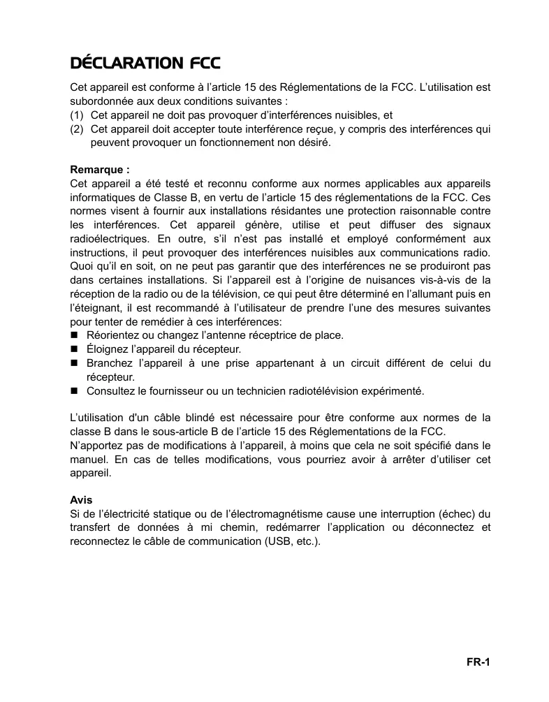 Cet appareil est conforme à l’article 15 des Réglementations de la FCC. L’utilisation est subordonnée aux deux conditions suivantes : (1) Cet appareil ne doit pas provoquer d’interférences nuisibles, et (2) Cet appareil doit accepter toute interférence reçue, y compris des interférences qui peuvent provoquer un fonctionnement non désiré. Remarque : Cet appareil a été testé et reconnu conforme aux normes applicables aux appareils informatiques de Classe B, en vertu de l’article 15 des réglementations de la FCC. Ces normes visent à fournir aux installations résidantes une protection raisonnable contre les interférences. Cet appareil génère, utilise et peut diffuser des signaux radioélectriques. En outre, s’il n’est pas installé et employé conformément aux instructions, il peut provoquer des interférences nuisibles aux communications radio. Quoi qu’il en soit, on ne peut pas garantir que des interférences ne se produiront pas dans certaines installations. Si l’appareil est à l’origine de nuisances vis-à-vis de la réception de la radio ou de la télévision, ce qui peut être déterminé en l’allumant puis en l’éteignant, il est recommandé à l’utilisateur de prendre l’une des mesures suivantes pour tenter de remédier à ces interférences: Réorientez ou changez l’antenne réceptrice de place. Éloignez l’appareil du récepteur. Branchez l’appareil à une prise appartenant à un circuit différent de celui du récepteur. Consultez le fournisseur ou un technicien radiotélévision expérimenté. L’utilisation d'un câble blindé est nécessaire pour être conforme aux normes de la classe B dans le sous-article B de l’article 15 des Réglementations de la FCC. N’apportez pas de modifications à l’appareil, à moins que cela ne soit spécifié dans le manuel. En cas de telles modifications, vous pourriez avoir à arrêter d’utiliser cet appareil. Avis Si de l’électricité statique ou de l’électromagnétisme cause une interruption (échec) du transfert de données à mi chemin, redémarrer l’application ou déconnectez et reconnectez le câble de communication (USB, etc.). FR-1