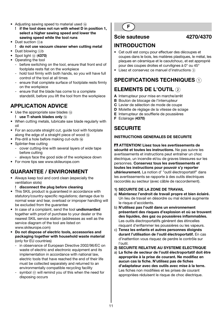 - For more tips see www.skileurope.com Interrupteur pour mise en marche/arrêt Bouton de blocage de l’interrupteur Levier de sélection de mode de coupe Molette de réglage de la vitesse de sciage Interrupteur de soufflerie de poussières Eclairage (4370) SECURITE