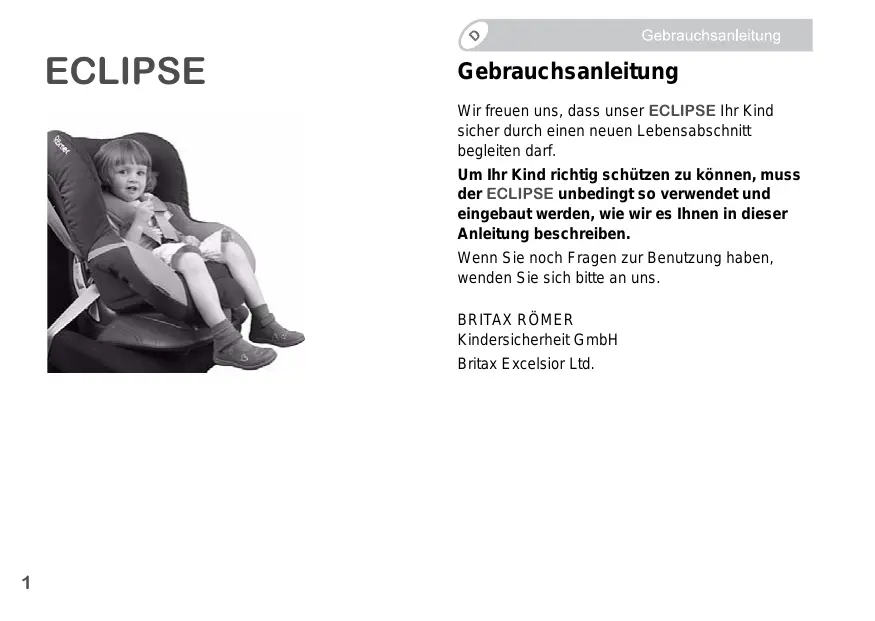 Kindersicherheit GmbH Britax Excelsior Ltd. Pour protéger efficacement votre enfant, le siège auto ECLIPSE doit impérativement être utilisé et installé de la manière décrite dans le présent mode d’emploi. Pour toute question complémentaire, n'hésitez pas à nous contacter.