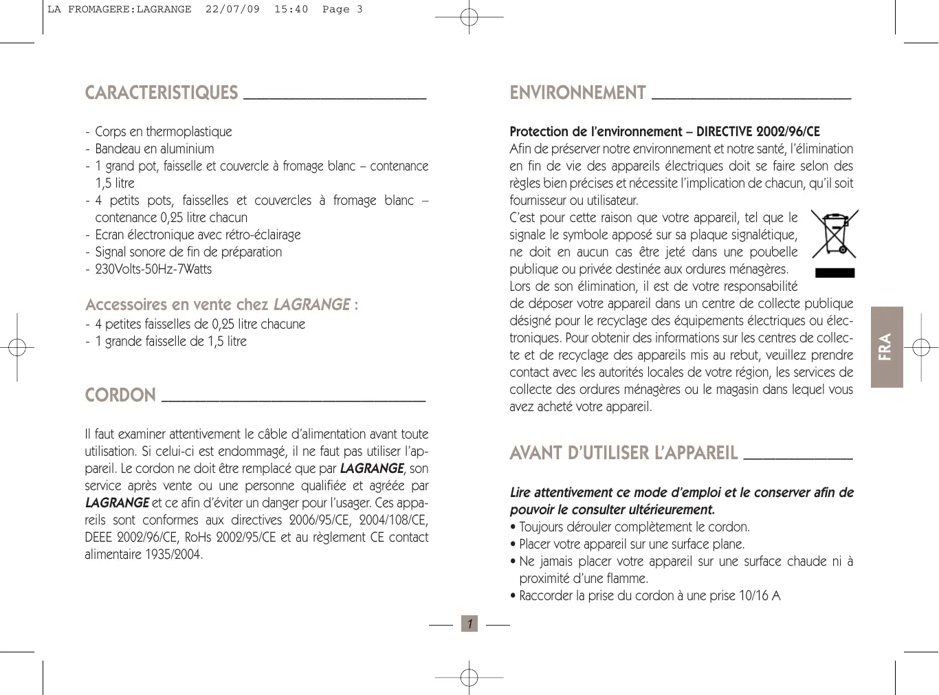 Il faut examiner attentivement le câble d'alimentation avant toute utilisation. Si celui-ci est endommagé, il ne faut pas utiliser l'appareil. Le cordon ne doit être remplacé que par LAGRANGE, son service après-vente ou une personne qualifiée et agréée par LAGRANGE et ce afin d'éviter un danger pour l'usager. Ces appareils sont conformes aux directives 2006/95/CE, 2004/108/CE, DEEE 2002/96/CE, RoHS 2002/95/CE et au règlement CE contact alimentaire 1935/2004.
