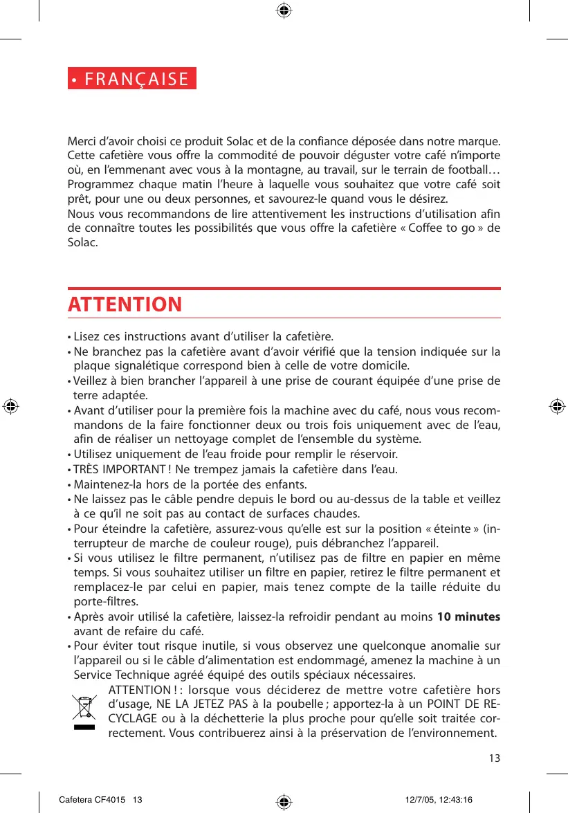 - FRANÇAISE Merci d’avoir choisi ce produit Solac et de la confiance déposée dans notre marque. Cette cafetière vous offre la commodité de pouvoir déguster votre café n’importe où, en l’emmenant avec vous à la montagne, au travail, sur le terrain de football… Programmez chaque matin l’heure à laquelle vous souhaitez que votre café soit prêt, pour une ou deux personnes, et savourez-le quand vous le désirez. Nous vous recommandons de lire attentivement les instructions d’utilisation afin de connaître toutes les possibilités que vous offre la cafetière « Coffee to go » de Solac. ATTENTION