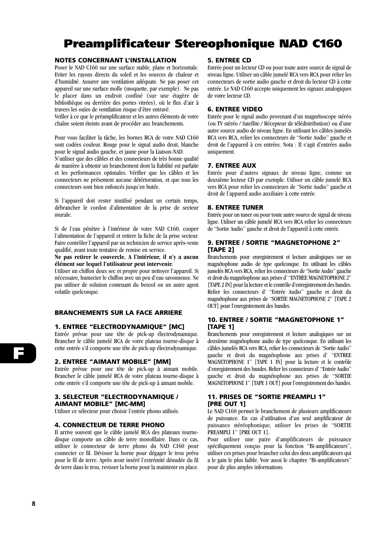 Veiller à ce que le préamplificateur et les autres éléments de votre chaîne soient éteints avant de procéder aux branchements. Pour vous faciliter la tâche, les bornes RCA de votre NAD C160 sont codées couleur. Rouge pour le signal audio droit, blanche pour le signal audio gauche, et jaune pour la Liaison-NAD. N’utiliser que des câbles et des connecteurs de très bonne qualité de manière à obtenir un branchement dont la fiabilité est parfaite et les performances optimales. Vérifier que les câbles et les connecteurs ne présentent aucune détérioration, et que tous les connecteurs sont bien enfoncés jusqu’en butée. Si l’appareil doit rester inutilisé pendant un certain temps, débrancher le cordon d’alimentation de la prise de secteur murale. Si de l’eau pénètre à l’intérieur de votre NAD C160, couper l’alimentation de l’appareil et retirer la fiche de la prise secteur. Faire contrôler l’appareil par un technicien de service après-vente qualifié, avant toute tentative de remise en service. Ne pas retirer le couvercle. A l’intérieur, il n’y a aucun élément sur lequel l’utilisateur peut intervenir. Utiliser un chiffon doux sec et propre pour nettoyer l’appareil. Si nécessaire, humecter le chiffon avec un peu d’eau savonneuse. Ne pas utiliser de solution contenant du benzol ou un autre agent volatile quelconque.