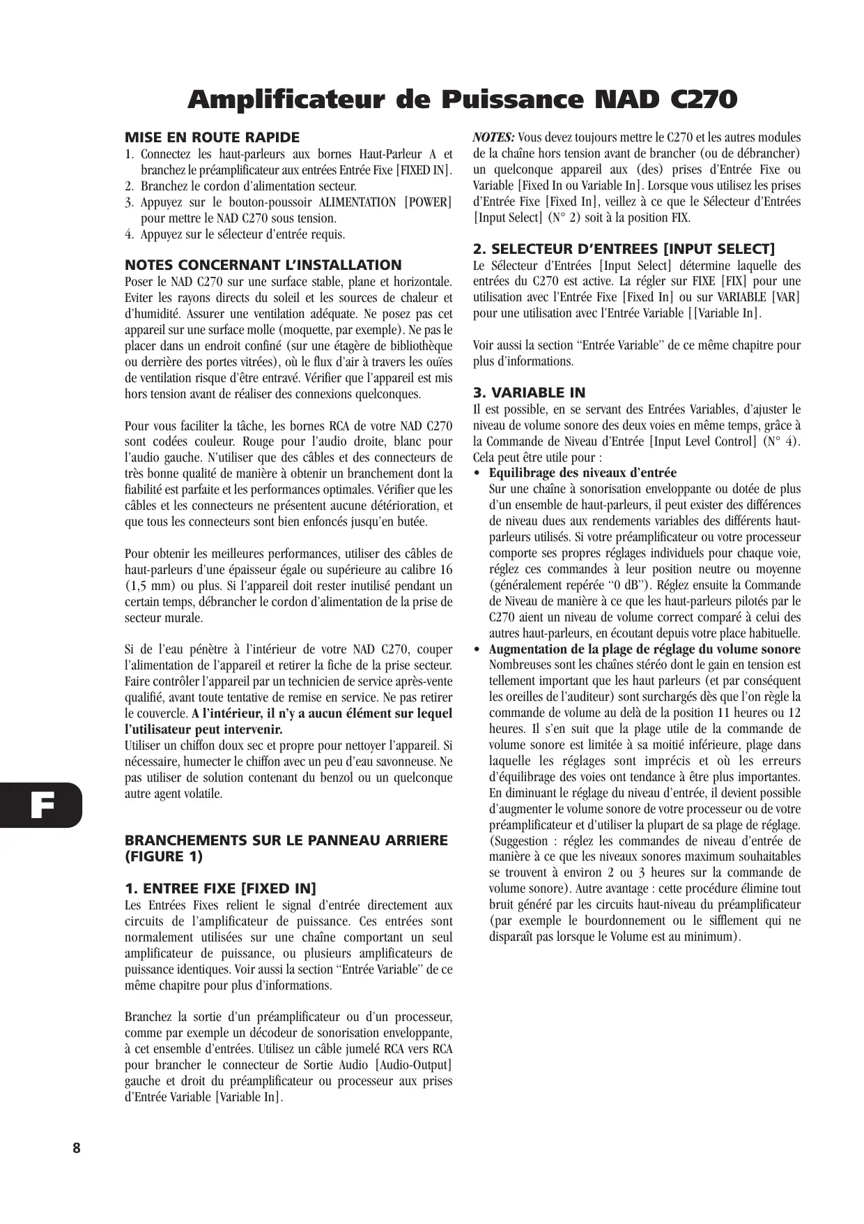 - Bi-Amplificateurs Certains haut-parleurs comportent des branchements distincts pour les sections BF (Basses Fréquences) et HF (Hautes Fréquences) de l’enceinte. Ce dispositif permet d’utiliser ces haut-parleurs en mode “Bi-Amplificateurs”, grâce auquel un amplificateur de puissance distinct est utilisé pour chaque section, BF et HF. Cela peut améliorer la qualité globale de la sonorité. Lorsque vous utilisez une configuration BiAmplificateurs comportant des modèles d’amplificateurs de puissance non identiques, il est probable que l’un des amplificateurs ait un “gain” plus important que celui de l’autre, ce qui entraîne un déséquilibrage au niveau du woofer et du tweeter du haut-parleur. Réglez la commande de niveau de manière à ce que l’équilibre entre le woofer et le tweeter soit parfait (gain identique pour les deux amplificateurs). N’utilisez que du fil torsadé haute puissance (calibre 16 ; 1,5 mm ou plus) pour brancher les haut-parleurs à votre NAD C270. On peut utiliser les bornes pour courants élevés comme bornes à visser pour les câbles comportant des cosses plates, des broches ou des fils nus. Branchez la sortie d’un préamplificateur ou d’un processeur, comme par exemple un décodeur de sonorisation enveloppante, à cet ensemble d’entrées. Utilisez un câble jumelé RCA vers RCA pour brancher le connecteur de Sortie Audio [Audio-Output] gauche et droit du préamplificateur ou processeur aux prises d’Entrée Variable [Variable In]. NOTA: Assurez-vous que l’impédance des haut-parleurs est d’au moins 4 ohms si vous ne connectez qu’une paire de haut-parleurs ; assurez-vous que l’impédance de tous les haut-parleurs est d’au moins 8 ohms si vous connectez deux paires de haut-parleurs. En Mode Ponté, l’impédance du haut-parleur unique doit aussi être d’au moins 8 ohms. Vous devez toujours mettre le C270 et les autres modules de la chaîne hors tension avant de brancher ou de débrancher les haut-parleurs. NOTES: Vous devez toujours mettre le C270 et les autres modules de la chaîne hors tension avant de brancher (ou de débrancher) un quelconque appareil aux (des) prises d’Entrée Fixe ou Variable [Fixed In ou Variable In]. Lorsque vous utilisez les prises d’Entrée Variable [Variable In], veillez à ce que le Sélecteur d’Entrées [Input Select] (N° 2) soit à la position VAR.
