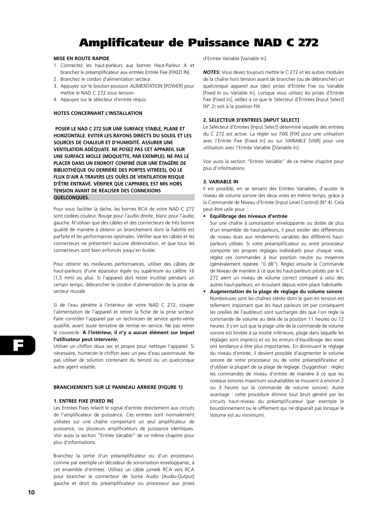 - Bi-Amplificateurs Certains haut-parleurs comportent des branchements distincts pour les sections BF (Basses Fréquences) et HF (Hautes Fréquences) de l’enceinte. Ce dispositif permet d’utiliser ces haut-parleurs en mode “Bi-Amplificateurs”, grâce auquel un amplificateur de puissance distinct est utilisé pour chaque section, BF et HF. Cela peut améliorer la qualité globale de la sonorité. Lorsque vous utilisez une configuration BiAmplificateurs comportant des modèles d’amplificateurs de puissance non identiques, il est probable que l’un des amplificateurs ait un “gain” plus important que celui de l’autre, ce qui entraîne un déséquilibrage au niveau du woofer et du tweeter du haut-parleur. Réglez la commande de niveau de manière à ce que l’équilibre entre le woofer et le tweeter soit parfait (gain identique pour les deux amplificateurs). N’utilisez que du fil torsadé haute puissance (calibre 16 ; 1,5 mm ou plus) pour brancher les haut-parleurs à votre NAD C 272. On peut utiliser les bornes pour courants élevés comme bornes à visser pour les câbles comportant des cosses plates, des broches ou des fils nus. Branchez la sortie d’un préamplificateur ou d’un processeur, comme par exemple un décodeur de sonorisation enveloppante, à cet ensemble d’entrées. Utilisez un câble jumelé RCA vers RCA pour brancher le connecteur de Sortie Audio [Audio-Output] gauche et droit du préamplificateur ou processeur aux prises d’Entrée Variable [Variable In]. NOTA: Assurez-vous que l’impédance des haut-parleurs est d’au moins 4 ohms si vous ne connectez qu’une paire de haut-parleurs ; assurez-vous que l’impédance de tous les haut-parleurs est d’au moins 8 ohms si vous connectez deux paires de haut-parleurs. En Mode Ponté, l’impédance du haut-parleur unique doit aussi être d’au moins 8 ohms. Vous devez toujours mettre le C 272 et les autres modules de la chaîne hors tension avant de brancher ou de débrancher les haut-parleurs. NOTES: Vous devez toujours mettre le C 272 et les autres modules de la chaîne hors tension avant de brancher (ou de débrancher) un quelconque appareil aux (des) prises d’Entrée Fixe ou Variable [Fixed In ou Variable In]. Lorsque vous utilisez les prises d’Entrée Variable [Variable In], veillez à ce que le Sélecteur d’Entrées [Input Select] (N° 2) soit à la position VAR.