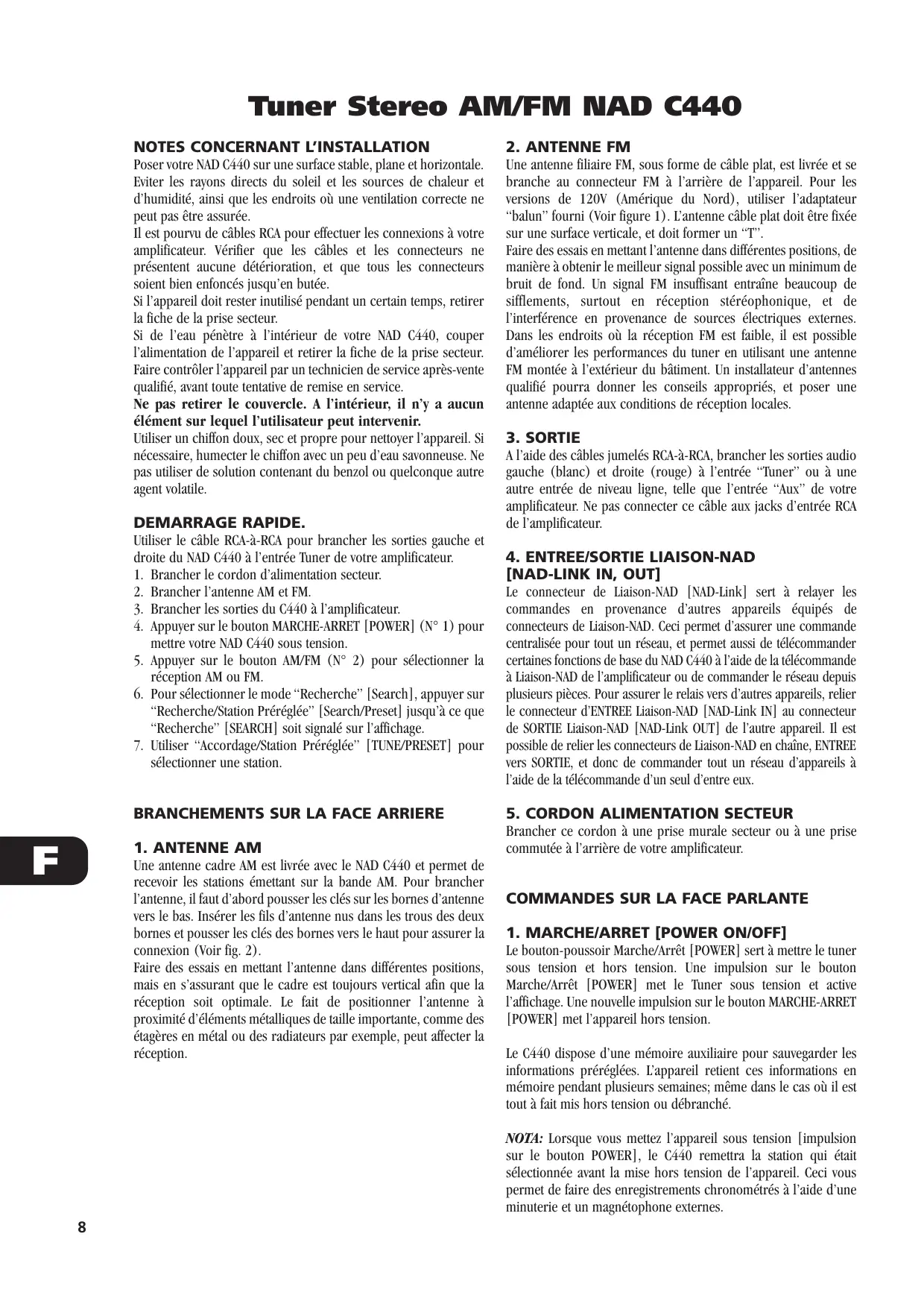 “balun” fourni (Voir figure 1). L’antenne câble plat doit être fixée sur une surface verticale, et doit former un “T”. Faire des essais en mettant l’antenne dans différentes positions, de manière à obtenir le meilleur signal possible avec un minimum de bruit de fond. Un signal FM insuffisant entraîne beaucoup de sifflements, surtout en réception stéréophonique, et de l’interférence en provenance de sources électriques externes. Dans les endroits où la réception FM est faible, il est possible d’améliorer les performances du tuner en utilisant une antenne FM montée à l’extérieur du bâtiment. Un installateur d’antennes qualifié pourra donner les conseils appropriés, et poser une antenne adaptée aux conditions de réception locales. 3. SORTIE A l’aide des câbles jumelés RCA-à-RCA, brancher les sorties audio gauche (blanc) et droite (rouge) à l’entrée “Tuner” ou à une autre entrée de niveau ligne, telle que l’entrée “Aux” de votre amplificateur. Ne pas connecter ce câble aux jacks d’entrée RCA de l’amplificateur. 4. ENTREE/SORTIE LIAISON-NAD [NAD-LINK IN, OUT] Le connecteur de Liaison-NAD [NAD-Link] sert à relayer les commandes en provenance d’autres appareils équipés de connecteurs de Liaison-NAD. Ceci permet d’assurer une commande centralisée pour tout un réseau, et permet aussi de télécommander certaines fonctions de base du NAD C440 à l’aide de la télécommande à Liaison-NAD de l’amplificateur ou de commander le réseau depuis plusieurs pièces. Pour assurer le relais vers d’autres appareils, relier le connecteur d’ENTREE Liaison-NAD [NAD-Link IN] au connecteur de SORTIE Liaison-NAD [NAD-Link OUT] de l’autre appareil. Il est possible de relier les connecteurs de Liaison-NAD en chaîne, ENTREE vers SORTIE, et donc de commander tout un réseau d’appareils à l’aide de la télécommande d’un seul d’entre eux. 5. CORDON ALIMENTATION SECTEUR Brancher ce cordon à une prise murale secteur ou à une prise commutée à l’arrière de votre amplificateur. COMMANDES SUR LA FACE PARLANTE 1. MARCHE/ARRET [POWER ON/OFF] Le bouton-poussoir Marche/Arrêt [POWER] sert à mettre le tuner sous tension et hors tension. Une impulsion sur le bouton Marche/Arrêt [POWER] met le Tuner sous tension et active l’affichage. Une nouvelle impulsion sur le bouton MARCHE-ARRET [POWER] met l’appareil hors tension. Le C440 dispose d’une mémoire auxiliaire pour sauvegarder les informations préréglées. L’appareil retient ces informations en mémoire pendant plusieurs semaines; même dans le cas où il est tout à fait mis hors tension ou débranché. NOTA: Lorsque vous mettez l’appareil sous tension [impulsion sur le bouton POWER], le C440 remettra la station qui était sélectionnée avant la mise hors tension de l’appareil. Ceci vous permet de faire des enregistrements chronométrés à l’aide d’une minuterie et un magnétophone externes.