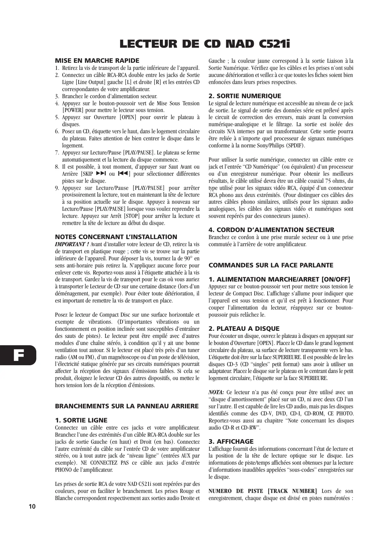 LECTEUR DE CD NAD C521i MISE EN MARCHE RAPIDE 1. Retirez la vis de transport de la partie inférieure de l’appareil. 2. Connectez un câble RCA-RCA double entre les jacks de Sortie Ligne [Line Output] gauche [L] et droite [R] et les entrées CD correspondantes de votre amplificateur. 3. Branchez le cordon d’alimentation secteur. 4. Appuyez sur le bouton-poussoir vert de Mise Sous Tension [POWER] pour mettre le lecteur sous tension. 5. Appuyez sur Ouverture [OPEN] pour ouvrir le plateau à disques. 6. Posez un CD, étiquette vers le haut, dans le logement circulaire du plateau. Faites attention de bien centrer le disque dans le logement. 7. Appuyez sur Lecture/Pause [PLAY/PAUSE]. Le plateau se ferme automatiquement et la lecture du disque commence. 8. Il est possible, à tout moment, d’appuyer sur Saut Avant ou Arrière [SKIP ou ] pour sélectionner différentes pistes sur le disque. 9. Appuyez sur Lecture/Pause [PLAY/PAUSE] pour arrêter provisoirement la lecture, tout en maintenant la tête de lecture à sa position actuelle sur le disque. Appuyez à nouveau sur Lecture/Pause [PLAY/PAUSE] lorsque vous voulez reprendre la lecture. Appuyez sur Arrêt [STOP] pour arrêter la lecture et remettre la tête de lecture au début du disque. NOTES CONCERNANT L’INSTALLATION IMPORTANT ! Avant d’installer votre lecteur de CD, retirez la vis de transport en plastique rouge ; cette vis se trouve sur la partie inférieure de l’appareil. Pour déposer la vis, tournez la de 90° en sens anti-horaire puis retirez la. N’appliquez aucune force pour enlever cette vis. Reportez-vous aussi à l’étiquette attachée à la vis de transport. Gardez la vis de transport pour le cas où vous auriez à transporter le Lecteur de CD sur une certaine distance (lors d’un déménagement, par exemple). Pour éviter toute détérioration, il est important de remettre la vis de transport en place. Posez le lecteur de Compact Disc sur une surface horizontale et exempte de vibrations. (D’importantes vibrations ou un fonctionnement en position inclinée sont susceptibles d’entraîner des sauts de pistes). Le lecteur peut être empilé avec d’autres modules d’une chaîne stéréo, à condition qu’il y ait une bonne ventilation tout autour. Si le lecteur est placé très près d’un tuner radio (AM ou FM), d’un magnétoscope ou d’un poste de télévision, l’électricité statique générée par ses circuits numériques pourrait affecter la réception des signaux d’émissions faibles. Si cela se produit, éloignez le lecteur CD des autres dispositifs, ou mettez le hors tension lors de la réception d’émissions.