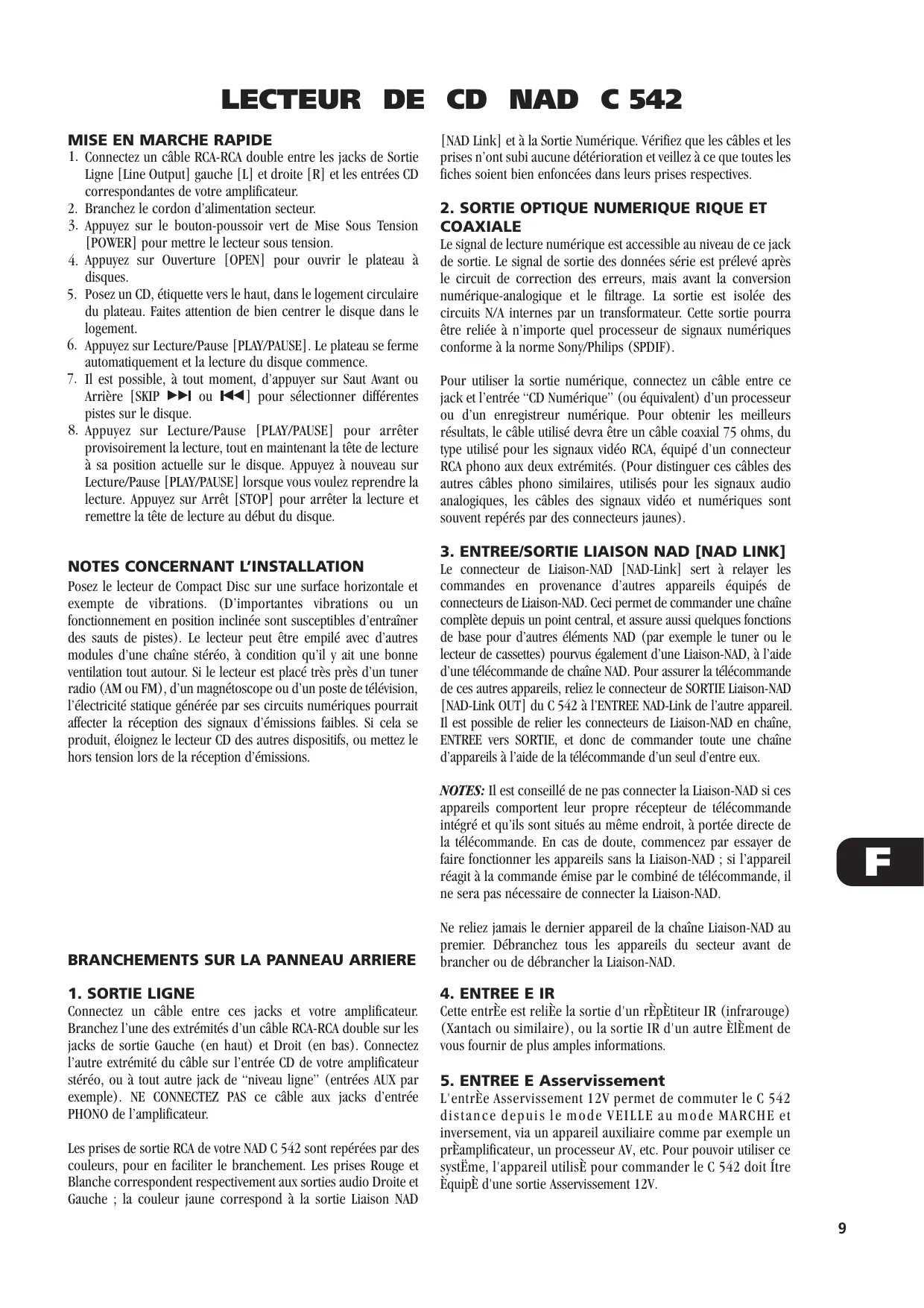 2. SORTIE OPTIQUE NUMERIQUE RIQUE ET COAXIALE Le signal de lecture numérique est accessible au niveau de ce jack de sortie. Le signal de sortie des données série est prélevé après le circuit de correction des erreurs, mais avant la conversion numérique-analogique et le filtrage. La sortie est isolée des circuits N/A internes par un transformateur. Cette sortie pourra être reliée à n’importe quel processeur de signaux numériques conforme à la norme Sony/Philips (SPDIF). Pour utiliser la sortie numérique, connectez un câble entre ce jack et l’entrée “CD Numérique” (ou équivalent) d’un processeur ou d’un enregistreur numérique. Pour obtenir les meilleurs résultats, le câble utilisé devra être un câble coaxial 75 ohms, du type utilisé pour les signaux vidéo RCA, équipé d’un connecteur RCA phono aux deux extrémités. (Pour distinguer ces câbles des autres câbles phono similaires, utilisés pour les signaux audio analogiques, les câbles des signaux vidéo et numériques sont souvent repérés par des connecteurs jaunes). 3. ENTREE/SORTIE LIAISON NAD [NAD LINK] Le connecteur de Liaison-NAD [NAD-Link] sert à relayer les commandes en provenance d’autres appareils équipés de connecteurs de Liaison-NAD. Ceci permet de commander une chaîne complète depuis un point central, et assure aussi quelques fonctions de base pour d’autres éléments NAD (par exemple le tuner ou le lecteur de cassettes) pourvus également d’une Liaison-NAD, à l’aide d’une télécommande de chaîne NAD. Pour assurer la télécommande de ces autres appareils, reliez le connecteur de SORTIE Liaison-NAD [NAD-Link OUT] du C 542 à l’ENTREE NAD-Link de l’autre appareil. Il est possible de relier les connecteurs de Liaison-NAD en chaîne, ENTREE vers SORTIE, et donc de commander toute une chaîne d’appareils à l’aide de la télécommande d’un seul d’entre eux. NOTES: Il est conseillé de ne pas connecter la Liaison-NAD si ces appareils comportent leur propre récepteur de télécommande intégré et qu’ils sont situés au même endroit, à portée directe de la télécommande. En cas de doute, commencez par essayer de faire fonctionner les appareils sans la Liaison-NAD ; si l’appareil réagit à la commande émise par le combiné de télécommande, il ne sera pas nécessaire de connecter la Liaison-NAD.